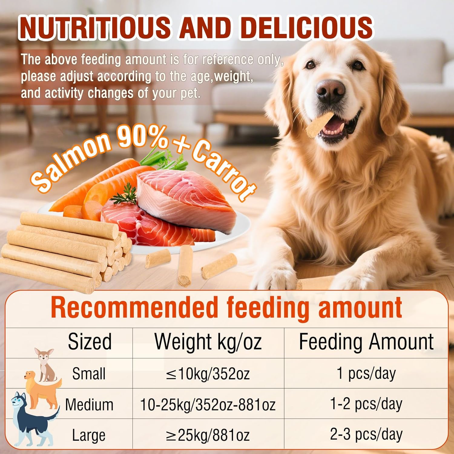 - Directions: 1.Good quality salmon and fresh carrots,scientific nutrition matching., 2.Freeze-drying technology is used to retain nutrients,promotes digestion,grinds teeth,cleans teeth,freshens breath., 3.This product is for pet use only,do not feed if it swells or is damaged during the shelf life.