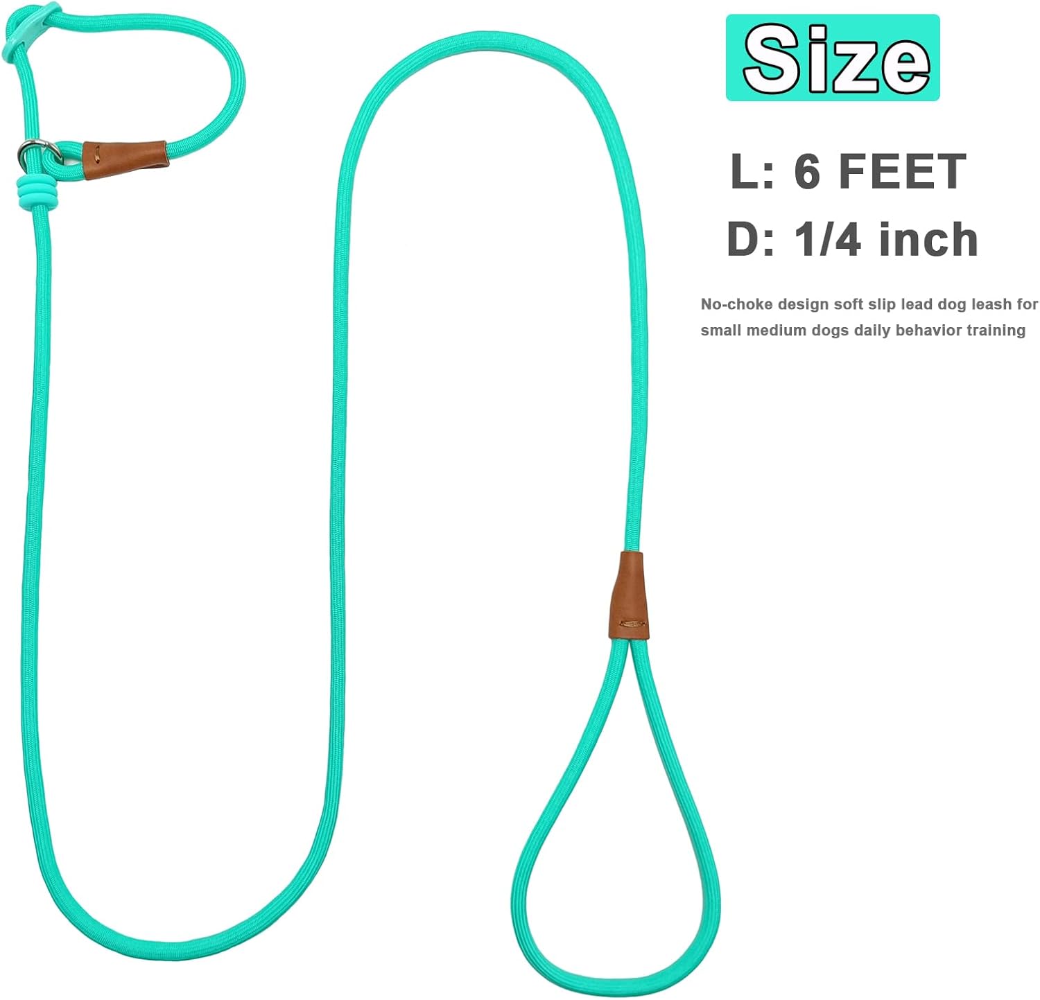• 1/4 inch slip rope leash great for several months puppies that is learning but hate traditional training collars. This slip lead is adjustable. Easy to put on and off. Comfortable and effectively to get their attention to listen to your directions