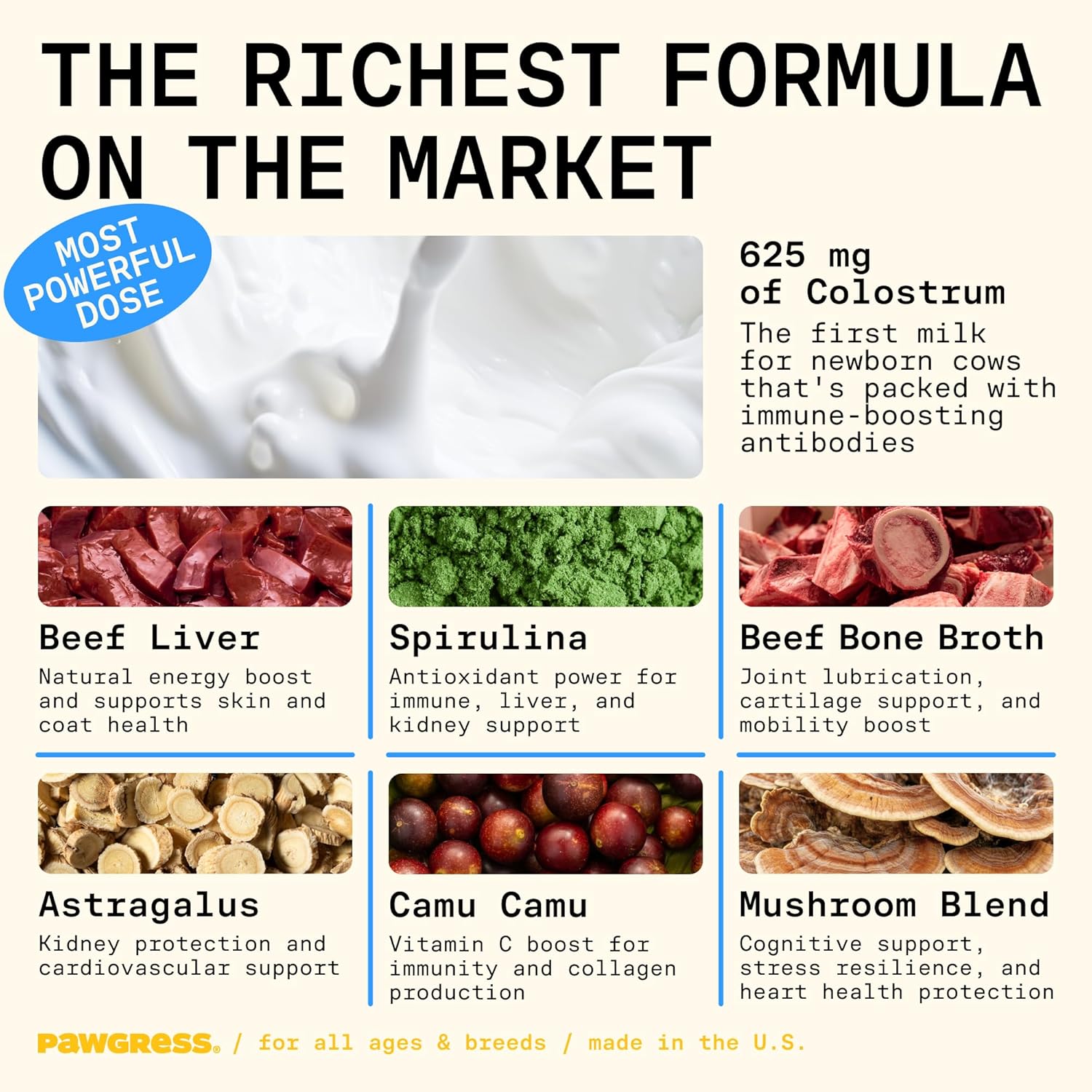 - Active Ingredients: Colostrum, Freeze Dried Beef Liver, Spirulina, Beef Bone Broth, Astragalus, Camu Camu, Mushroom Blend.See more