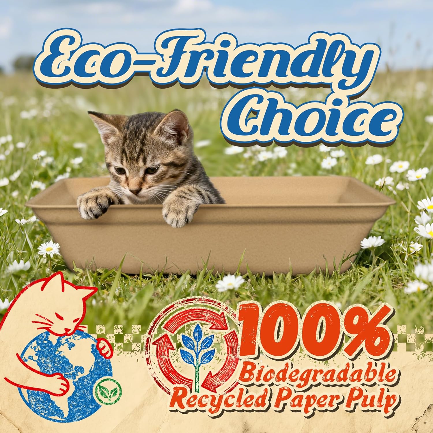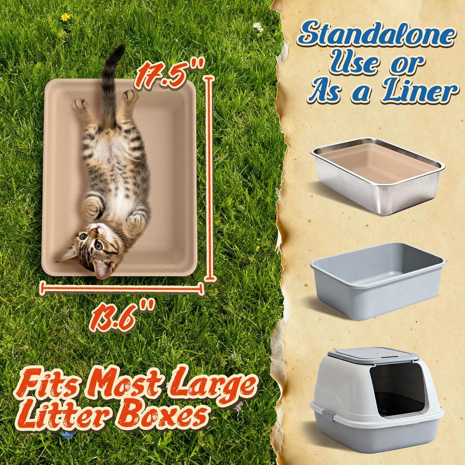 About this item Sustainable, Leak-Proof & Durable: Crafted from 100% biodegradable recycled paper pulp, this sustainable litterbox is a planet-friendly choice. Its multi-layer waterproof design provides superior leak-proof protection, resisting soaking and effectively containing liquids. Sturdy enough for 3-4 weeks of reliable use, this odor-control tray also prevents smell absorption, ensuring a fresher home. It's the durable, eco-conscious solution for cat owners Large for Most Cats & Kittens: The large, stable base prevents tipping, make it comfortably accommodate most adult cats and kittens. Whether you have a single cat or are caring for foster cats, this litterbox provides ample room to ensure each one can have a comfortable and private space by providing one for each Hassle-Free Cleanup & Health Protection: Enjoy the ultimate convenience with this disposable litter box. There's no scrubbing or heavy lifting—simply use and dispose of the entire box. This system is especially beneficial for multi-cat homes, as using separate boxes provide a healthier space by minimizing shared contact, promoting well-being for all your pets Perfect for Indoor, Travel & Temporary Use: Your go-to solution for any scenario! Use it indoors for everyday convenience, take it on road trips and RV adventures, or leave it for short-term cat sitting. Its portable design makes it perfect for travel, temporary setups, and foster care, ensuring your kitty always has a clean, familiar spot For Independent Use or as A Liner: Experience versatile functionality! Use this tray as an independent litter box anywhere in your home. Alternatively, it fits perfectly inside most large hooded or open-top litter boxes as a highly effective liner. This 2-in-1 design eliminates the need for scrubbing the permanent base, making maintenance quicker and easier than ever before › See more product details