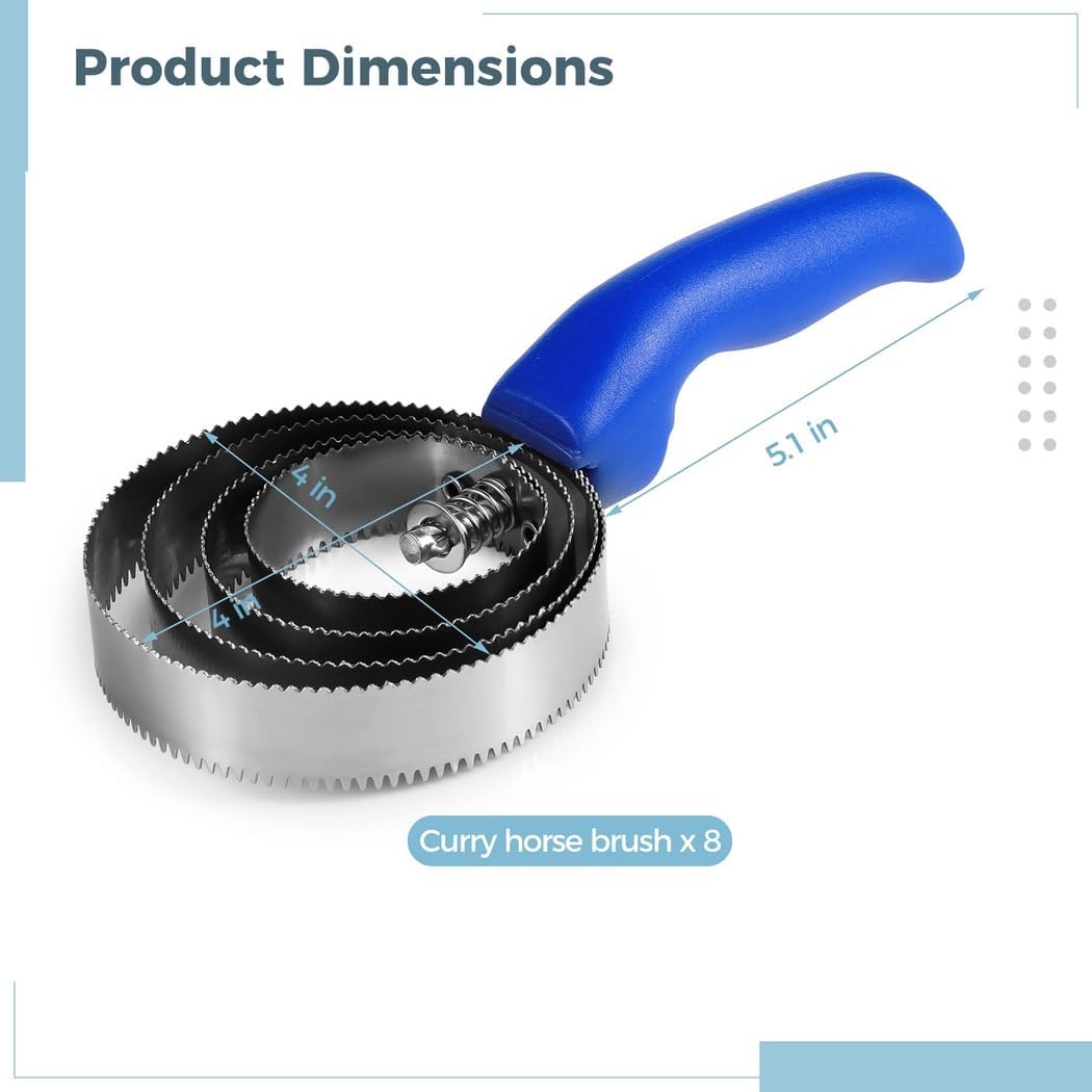 Color: silver blue Material: stainless steel Product size: diameter 4 inches Package Includes: horse comb x 8 Note: - Please refer to the measurement. Tiny measuring error is allowable in normal range. - There might be a little color difference due to the monitor, camera or other factors, please refer to the physical item.