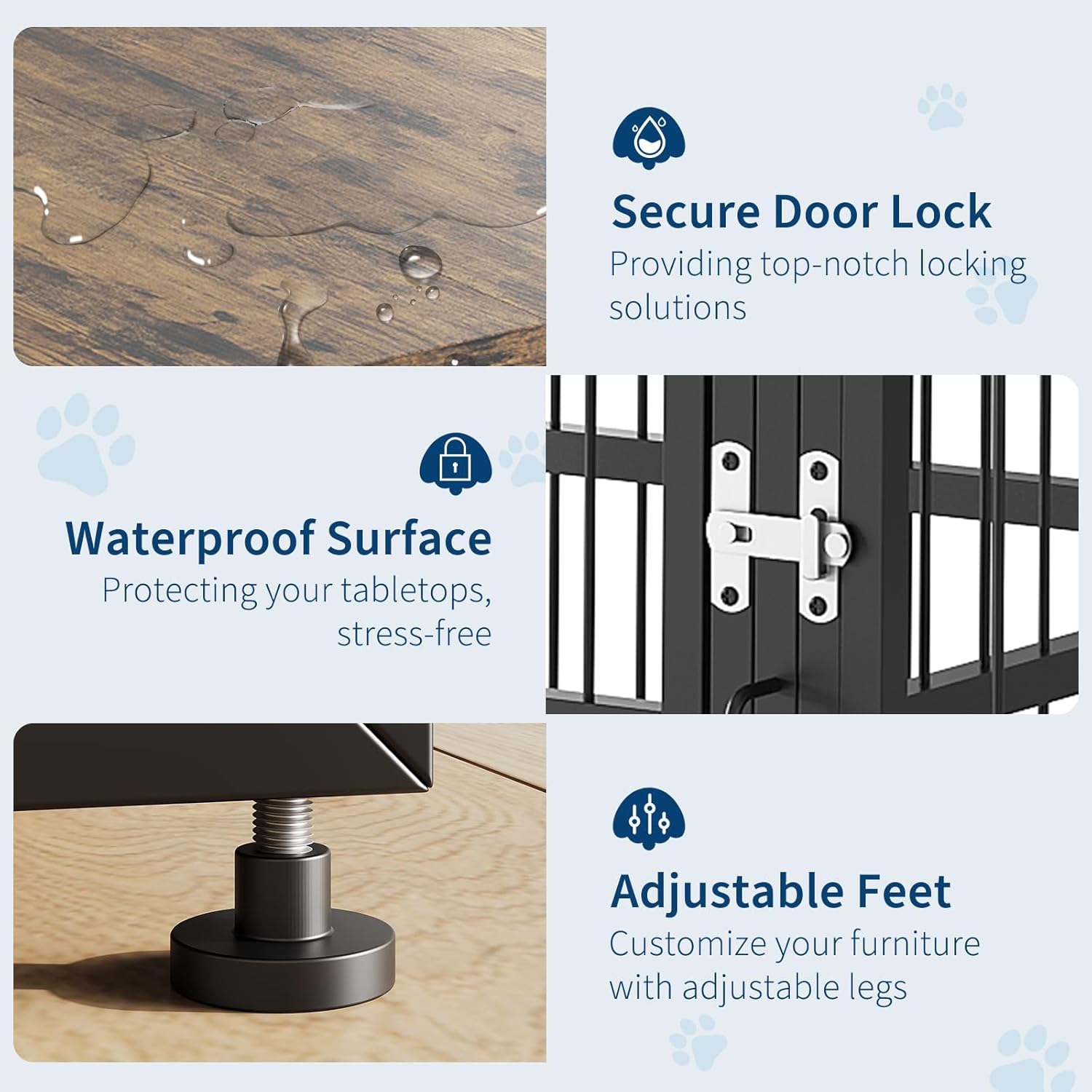 Indoor Double Dog CrateGive your loved dogs the comfort and security they deserve while adding style and functionality to your home—let this double dog crate become both a safe house for your dogs and a beautiful centerpiece in your living space!Brief Overview-Roomy Dog Crate Furniture for Two Medium to Large Dogs-3 Lockable Doors for Easy Access and Security-Reinforced Wooden Boards and Metal Pipes for Kennel Durability-Adaptable Kennel Space with Removable Divider-Multi-Functional Wooden Indoor Dog House TV StandSpecificationName: Indoor Double Dog CrateSize: Extra LargeStyle: RetroFrame Material: Metal & Engineered WoodColor: BlackProduct Dimensions: 86.61'' L x 27.95'' W x 32.5'' HPacking List1 x Double Dog Crate1 x Instruction Manual1 x Hardware BagFriendly Notice1. Please make sure three doors are securely locked after placing your dogs inside to ensure their safety.2. For your pets' comfort, add a soft mat or bedding to each side of the crate and clean the interior regularly to maintain a fresh environment.3. Adjust the divider according to your dogs' size and habits so they each have enough space to relax comfortably and happily.
