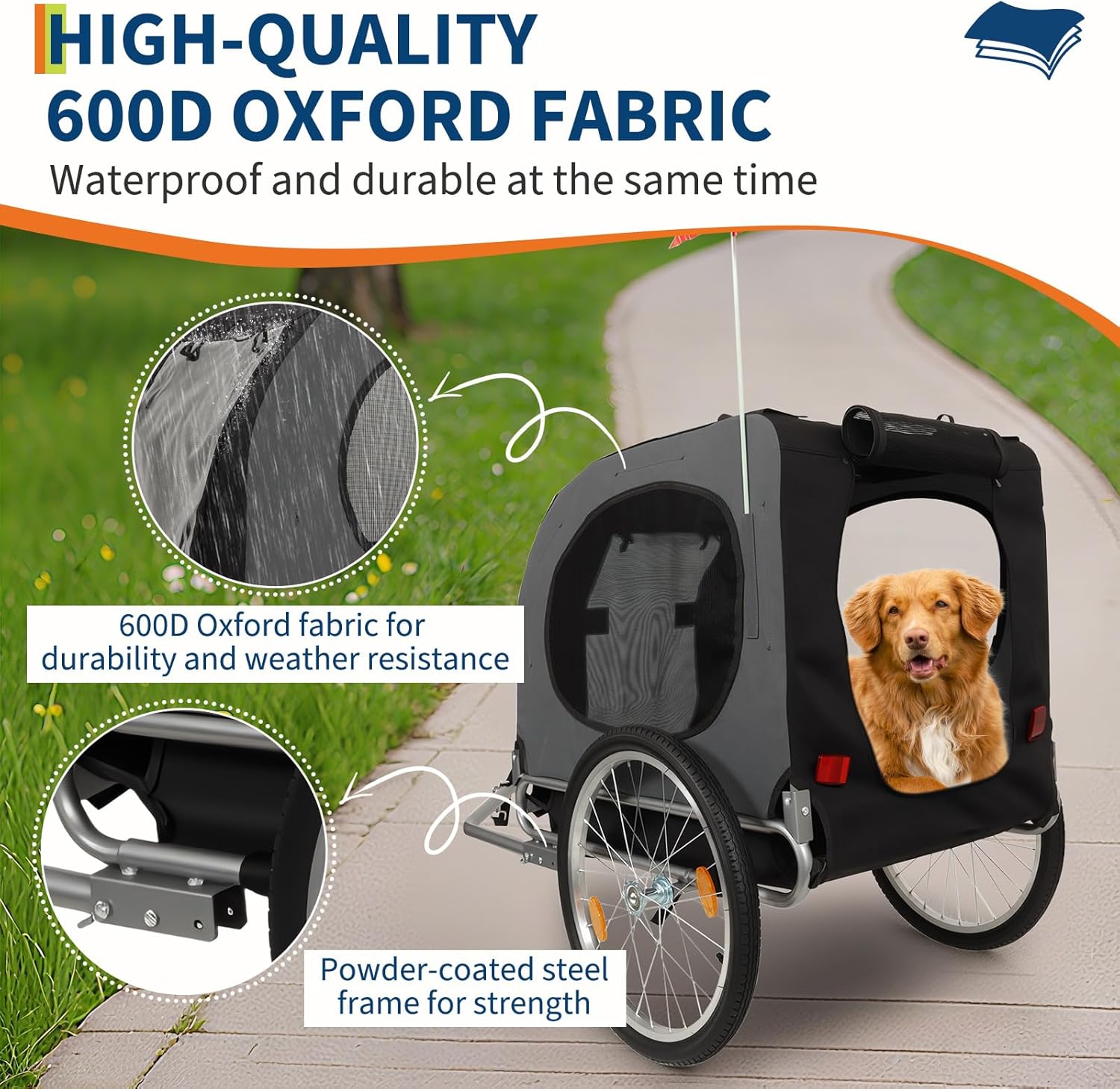【All-Terrain Dog Bike Trailer】Fits 22"-28" bikes with quick, tool-free attachment. Waterproof & UV-resistant with 88lbs capacity. Panoramic window & adjustable mesh ventilation ensure a safe, comfortable ride for your pet.【Secure & Smooth-Ride Pet Trailer】Features a sturdy frame, full suspension, and air-filled tires to absorb shocks. Includes a safety tether and reflective strips. Folds compactly with quick-release wheels for easy car storage and travel.【Versatile Pet Travel Carrier】Functions as a bike trailer or jogging stroller. Front/rear zippered doors for easy access. Waterproof, easy-clean interior with mesh and PVC layers adapts to various weather, perfect for outdoor adventures.Product Features: Material:Steel frame and 600D Oxford fabricSize:29.92 X 21.65 24.40 inchProduct List: 1 X Dog cart for bike