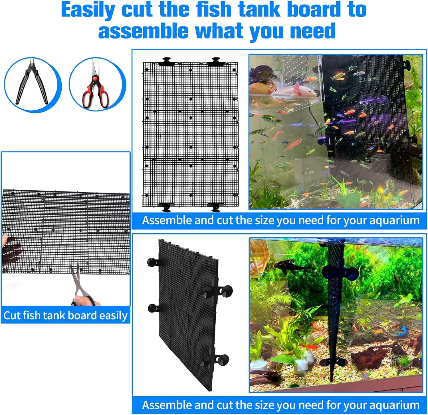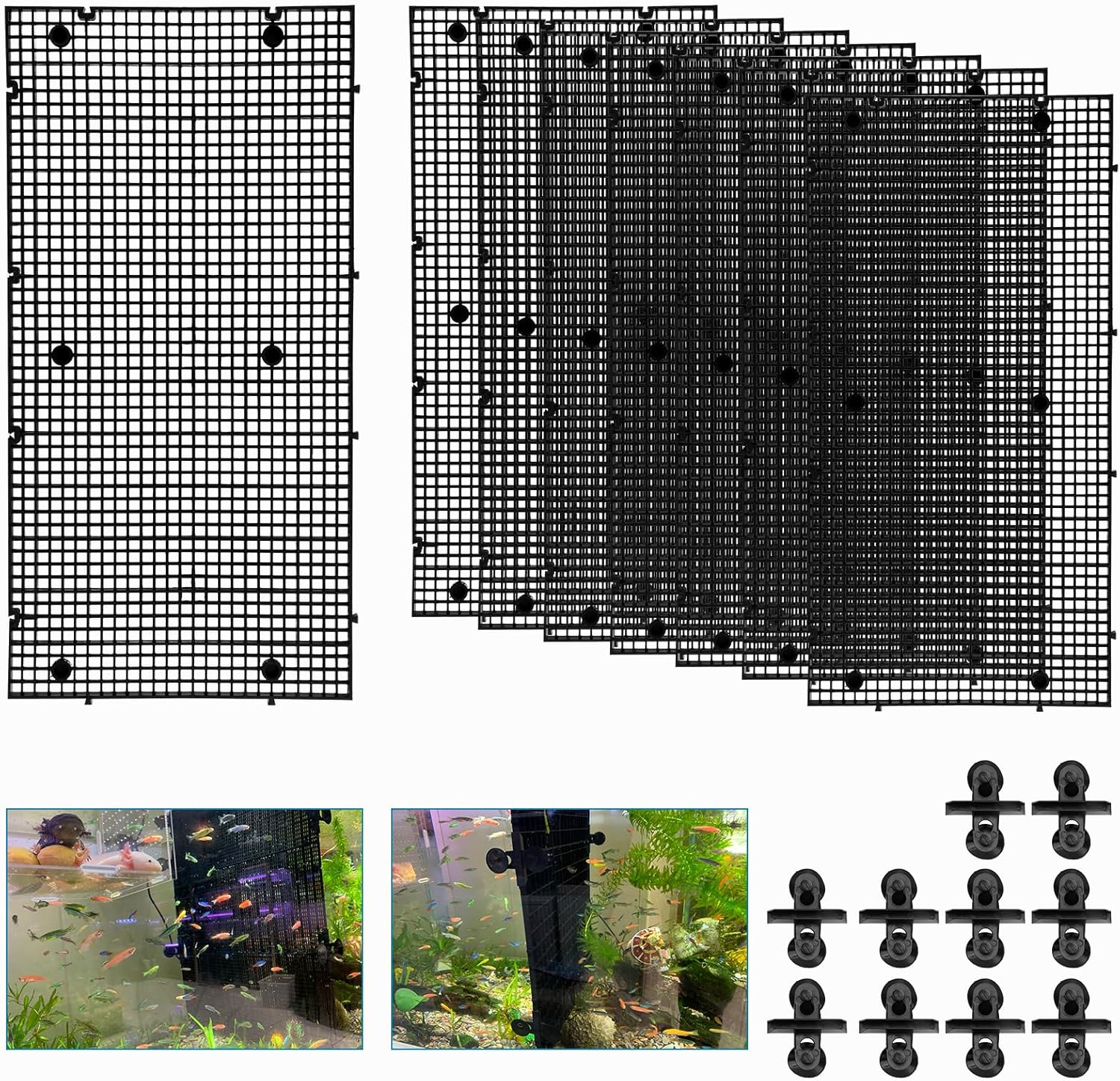 About this item 【Product size】aquarium divider separator kit includes 8pcs 11.8 Inch X 5 .9 Inch aquarium divider boards with 0.15Inch hole and 10pcs clips with suction. 【Novel DIY design】Our fish tank divider separate boad can be freely pieced together through concave convex buckles, and can be cut into the shape you want with scissors according to your tank needs. 【Made of high quality materials】Durable,Sturdy, strong weighing capacity and not easy to be broken which can effectively prevent birds or cats from scratching fish 【Product usage functions】The aquarium board can be used as a fish tank isolation board. First, cut the board to the size you need, and then install aquarium divider with suction cup clips to separate the fish tank into multiple independent spaces, avoiding some fish from biting each other etc Our aquarium board can also be used as Aquarium divider,Turtle basking platform,Aquarium lid,Aquarium stone base plate,Aquarium filter media bottom plate,Egg crate and the bottom plate of the aquarium and so on › See more product details