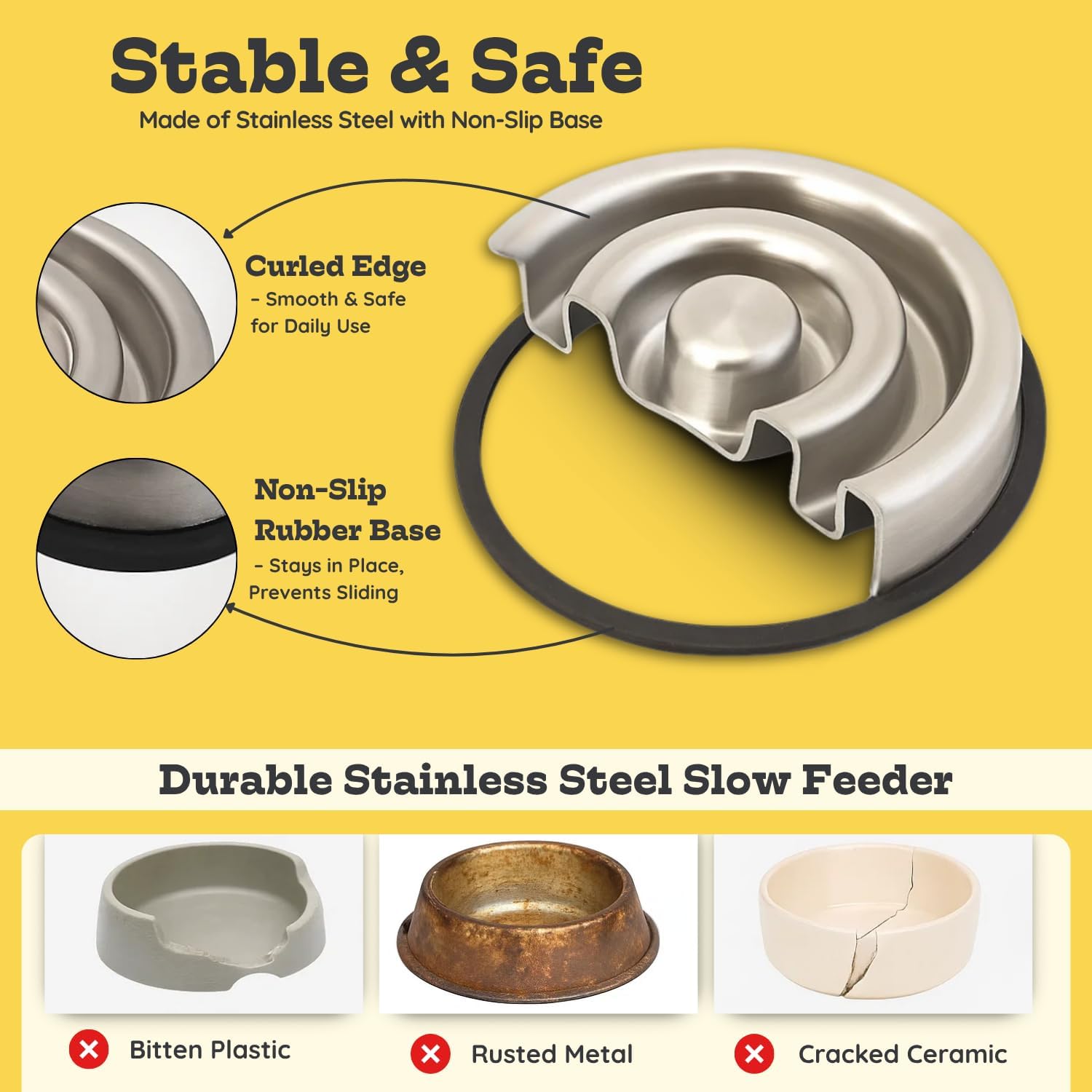 About this item Encourages Slow Feeding: Spiral ridge design helps pets eat more slowly, supporting better portion control and reducing messy mealtime behavior Durable Stainless Steel Construction: Made from good, rust-resistant stainless steel that withstands daily use and maintains a clean, food-safe surface Non-Slip Rubber Base: Fitted with a rubberized ring that helps keep the bowl securely in place during feeding, minimizing sliding and spills 9.5 oz (1Cup / .24L) Capacity – Ideal for 10–35lb Pets: Perfect portion size for small to medium pets such as small breed dogs and cats weighing between 10–35lbs (4.5–16 kg) Easy to Clean and Maintain: Dishwasher-safe and simple to hand wash. Smooth stainless-steel surface ensures hassle-free cleaning and a hygienic feeding setup Size and Fit Guidance: Dimensions – 9"L × 9"W × 2"H (22.8 × 22.8 × 5 cm). Recommended for pets 10–35lbs. Please review your pet’s size and feeding needs before purchase to ensure the best fit. › See more product details
