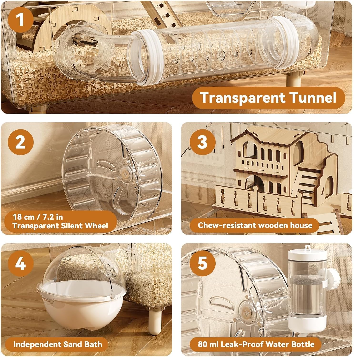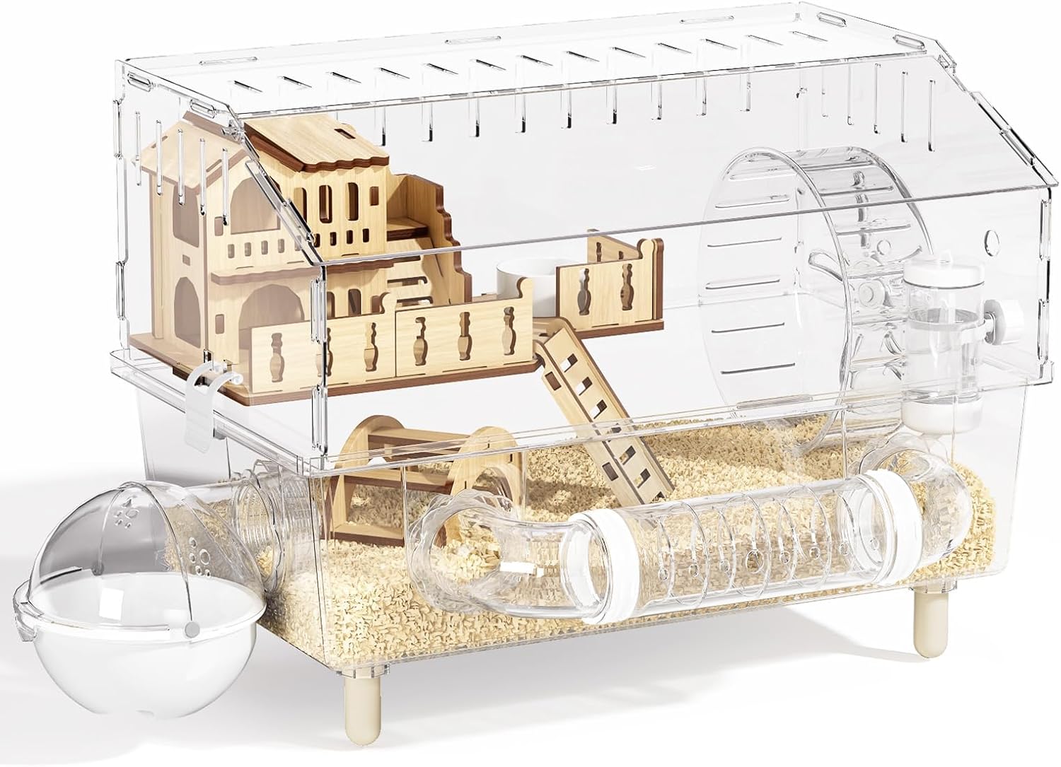 About this item 【Complete Starter Kit】This hamster cage comes with a complete set of accessories, including the cage itself, a wooden house, an 18cm silent running wheel, a sand bath, a tunnel, a water bottle, a food bowl, an arched bridge, a platform, and a ladder. All essential accessories are included, eliminating the need for additional purchases and ensuring your hamsters has a comfortable and enriching living environment. 【360° clear View】The entire cage frame is made of highly clear acrylic panels, allowing you to clearly see your small animal every move from any angle. Enjoy close interaction with your pet anytime, providing an up-close observation experience. 【Top Opening & Removable Base】The top opening design makes it easy to feed, play with, and interact with your hamster. The side features a removable clip, allowing you to easily remove the tray, change the bedding, and clean the internal accessories. Effectively keeping the habitat clean. 【Ventilation Design】The top, back, and sides of the cage feature 5mm ventilation holes, effectively preventing hamster escape while ensuring air circulation, reducing odors, and creating a comfortable and fresh environment. 【24/7 Customer Support & Guarantee】We offer 24/7 customer support to resolve any issues you may encounter during use and installation. Please be sure to remove the protective film from the acrylic panel before installation to ensure a clear and transparent view. › See more product details