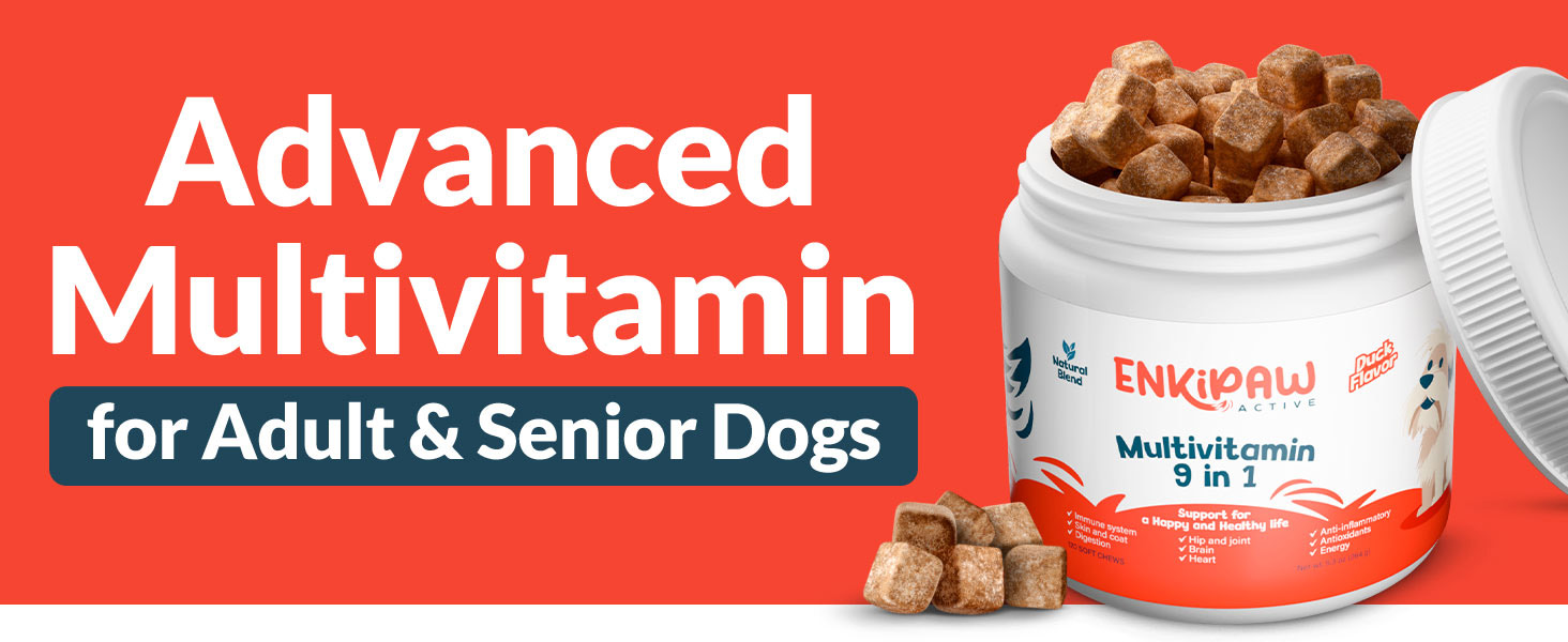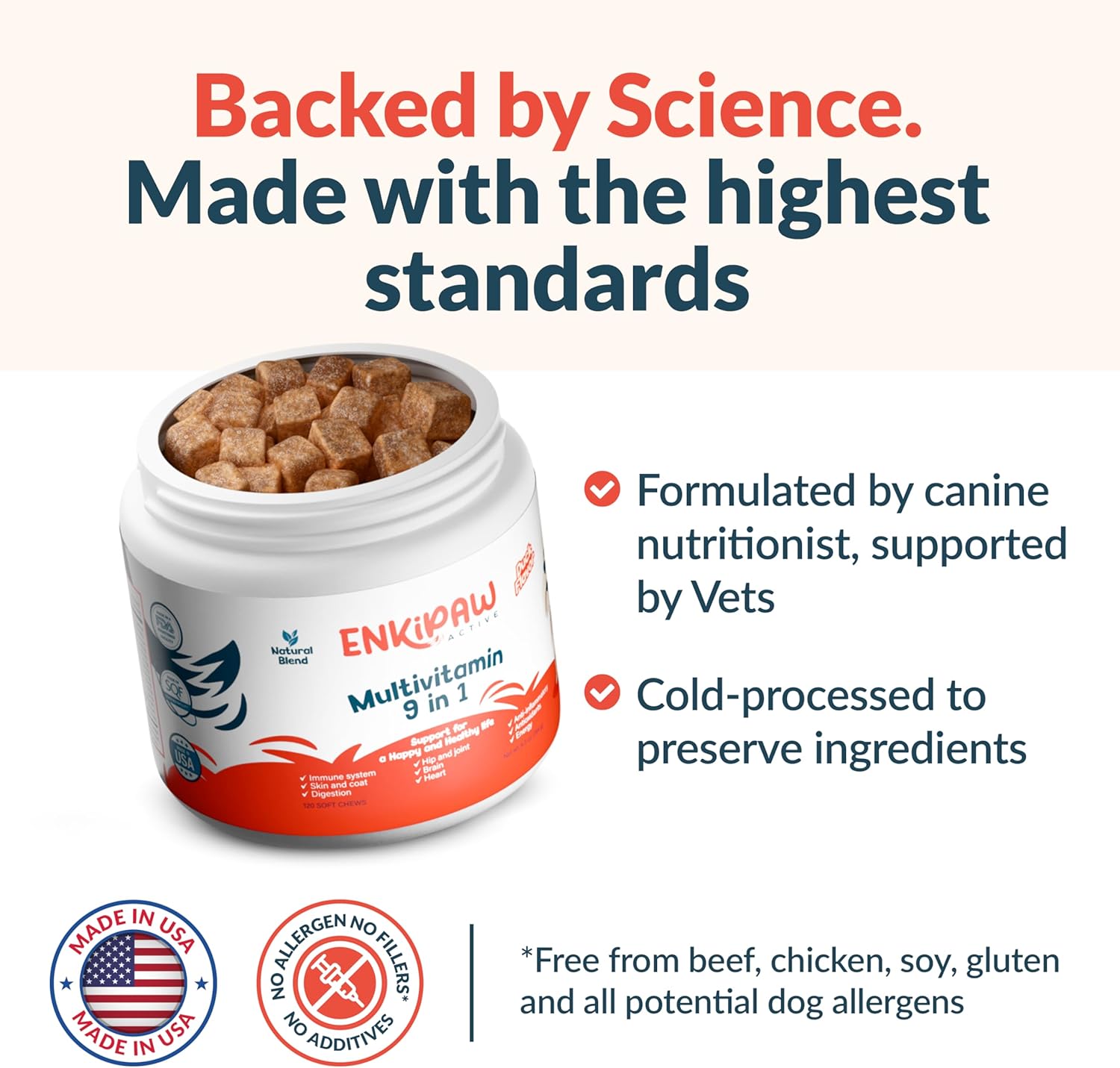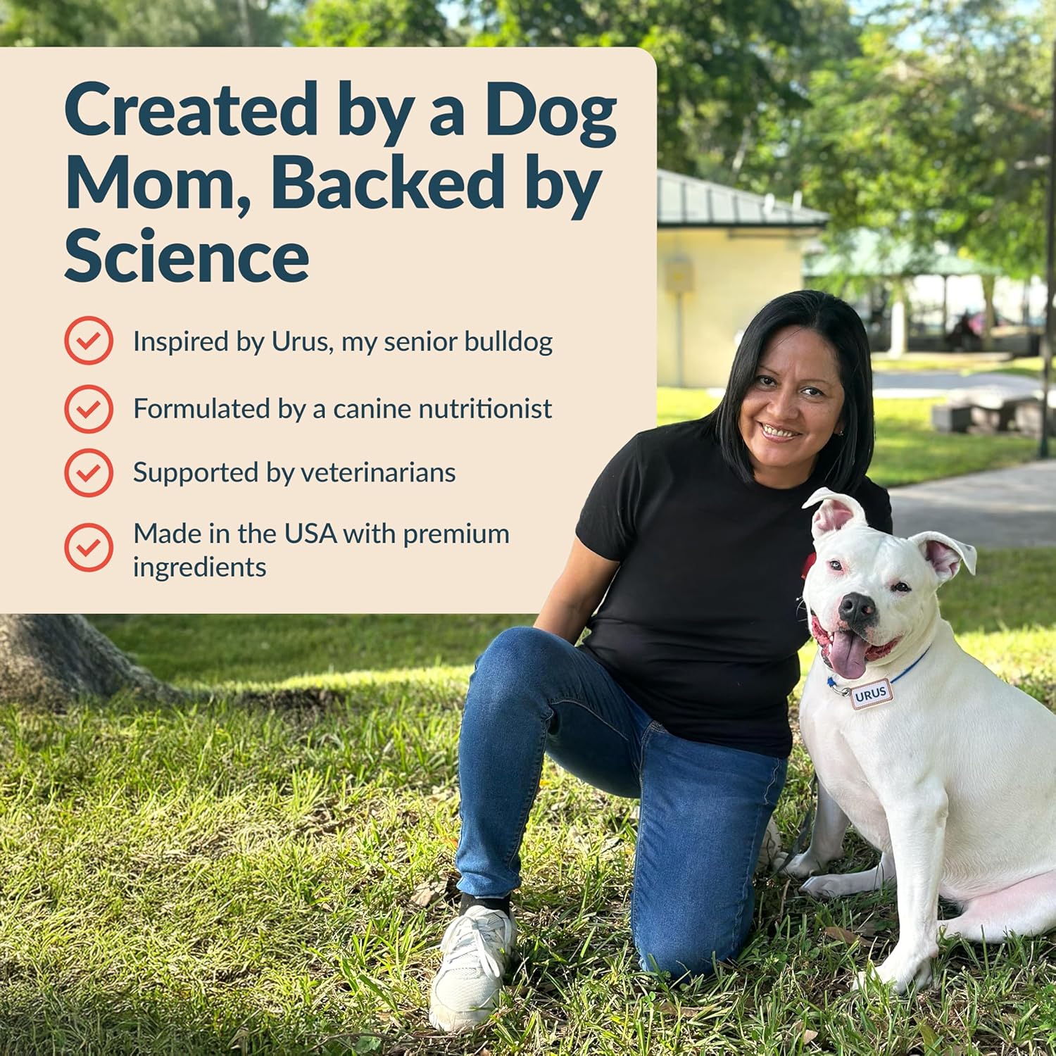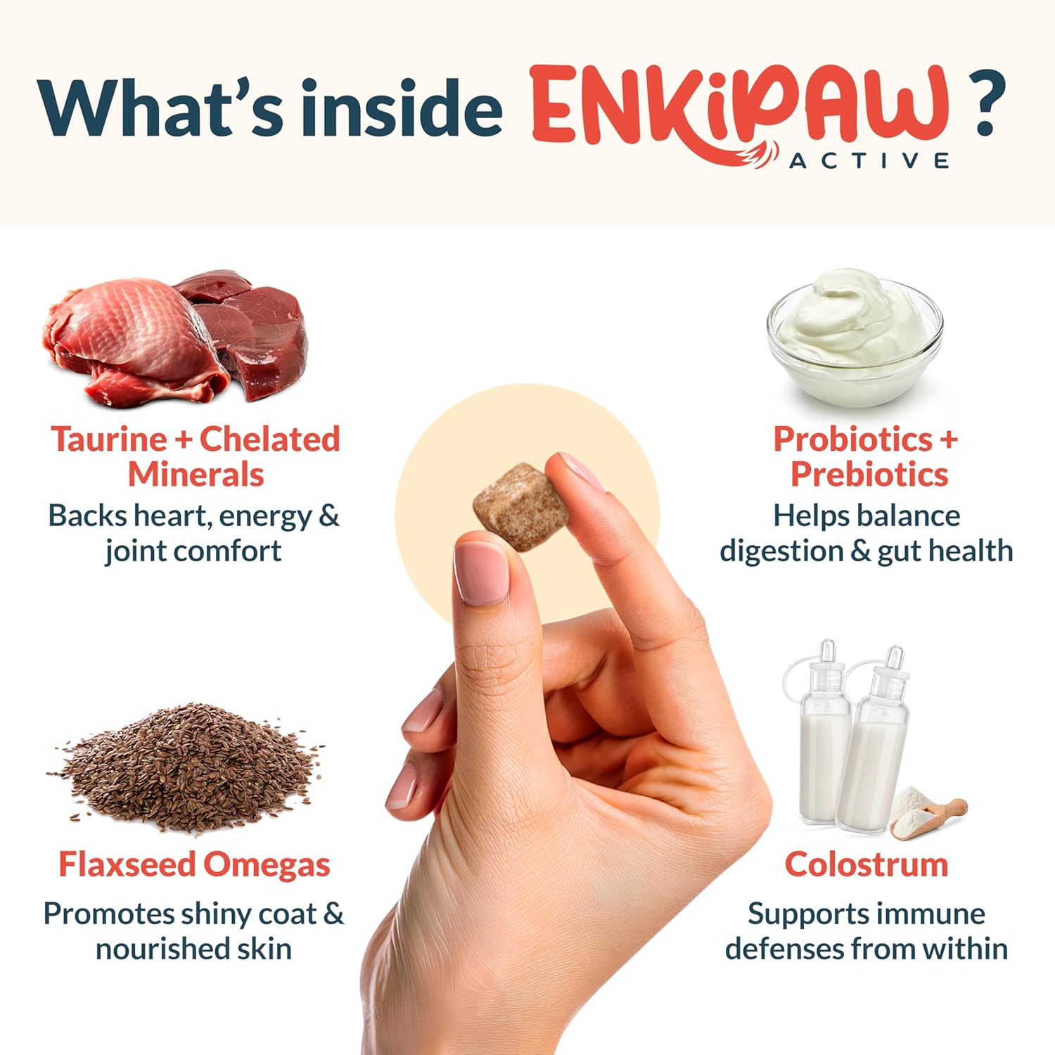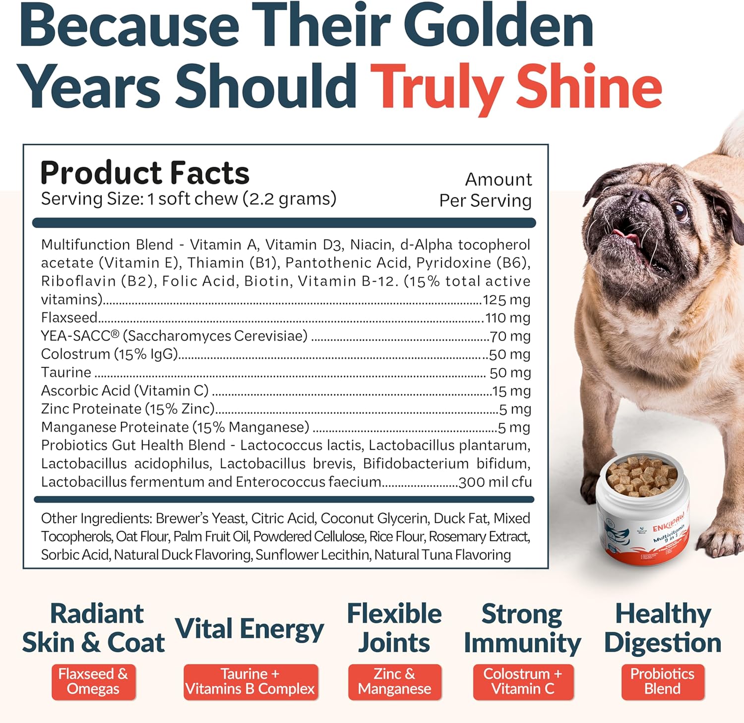 About this item DAILY SUPPORT FOR SENIOR DOGS – Boosts mobility, immunity, and daily energy. This blend for aging dogs is packed with taurine and B-complex vitamins for heart health and daily energy, probiotics for smoother digestion, colostrum and vitamin C for strong immunity, plus flaxseed and natural omegas to support a shiny coat and healthy skin. IRRESISTIBLE DUCK FLAVOR | GENTLE ON SENTITIVE TUMMIES – Dogs love the rich duck taste of these soft chews—no need to hide them in treats! Made without common allergens like chicken, beef, wheat, corn, soy, or dairy, and cold-pressed to preserve nutrients for maximum potency. SUPPORT FOR THEIR GOLDEN YEARS – As dogs age, it’s hard to watch them slow down, struggle with energy, or lose the spark that makes them ''them''. This daily multivitamin offers gentle, science-backed support to help your senior pup stay active, alert, and comfortable—so they can age with the vitality and dignity they deserve. INSPIRED BY URUS - OUR SENIOR DOG – When our founder adopted Urus, a sweet senior dog with fading energy, she searched for a natural way to help him feel like himself again. After months of research and seeing Urus thrive with a custom vitamin blend, she made it her mission to share this solution with other dog parents. That’s how Enkipaw was born—a small business built from love, dedication, and one very special dog. EASY DOSAGE AND ROUTINE: Just one tasty chew a day for dogs up to 25 lbs, and up to 5 chews for bigger pups. For best results, give daily for 4–6 weeks and watch your dog’s energy, coat, and overall vitality come back to life. › See more product details