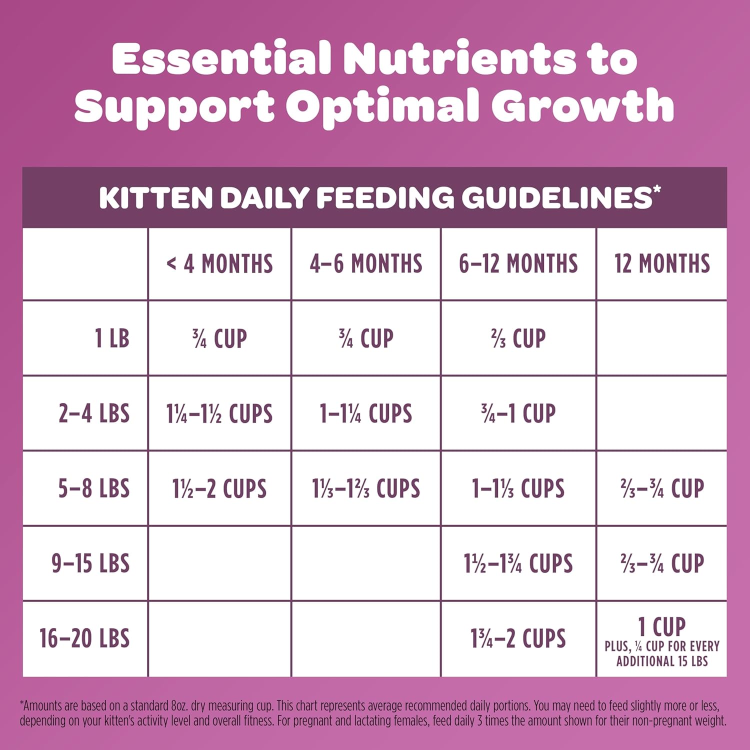 - Directions: DAILY FEEDING AMOUNT* KITTEN SIZE/AGE < 4 MONTHS 4 - 6 MONTHS 6 - 12 MONTHS > 12 MONTHS (Adult) 1 lbs. 3/4 cup 3/4 cup 2/3 cup --------- 2 - 4 lbs. 1 1/4 - 1 1/2 cups 1 - 1 ¼ cups 3/4 - 1 cup --------- 5 - 8 lbs. 1 1/2 - 2 cups 1 1/3 - 1 2/3 cups 1 - 1 1/3 cups 2/3 - 3/4 cup 9 - 15 lbs. --------- --------- 1 1/2 - 1 3/4 cups 2/3 - 3/4 cup 16 - 20 lbs. --------- --------- 1 3/4 - 2 cups 1 cup+ + Plus 1/4 cup for every additional 15 lbs. For pregnant and lactating females, feed daily 3 times the amount shown for their non-pregnant weight. *Amounts are based on a standard 8 oz. dry measuring cup. This chart represents average recommended daily portions. You may need to feed slightly more or less, depending on your kitten's activity level and overall fitness.