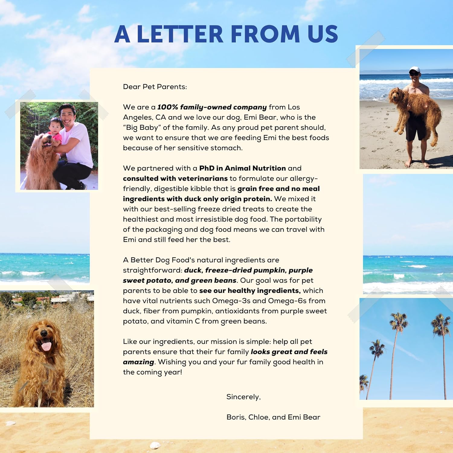 About this item ALLERGY FRIENDLY FOR SENSITIVE STOMACHS– For healthier and smoother digestion our food has no chicken, no meal ingredients, no grains, and only duck animal protein. We designed this for pets with allergies, intolerances, a sensitive stomach, or just pets that want clean, healthy dog food. RAW YOU CAN SEE INGREDIENTS FOR REAL HEALTH BENEFITS: We’ve mixed our freeze dried raw pumpkin and air dried purple sweet potato to further supplement digestion and aid in food transition. We also added our freeze dried raw duck and green beans to help entice picky eaters to chow down. We use these simple ingredients so pet parents can see the quality of the whole food ingredients we use. The kibble is formulated by a Ph. D. in Animal Nutrition and is AAFCO approved and uses salmon as the #1 ingredient! FREEZE DRIED RAW PIECES: We’ve used our bestselling single ingredient freeze dried wild caught duck with freeze dried pumpkin and green beans to boost nutrients such as Omega 3 and fiber. Freeze drying is the best way to preserve natural nutrients, with over 61% more nutrients retained relative to dehydration or cooking. Most importantly you can see the quality whole food ingredients we are using! THE BEST RAW FRIENDLY DOG FOOD: A Better Dog Food mixes allergy friendly ingredients and probiotics in our kibble with freeze dried raw treats in one bag. A complete and balanced nutrition for dogs of all types, including small breeds, puppies, and seniors. We also use a sturdy resealable bag to make it easier to grab and go! A BETTER DOG FOOD, YOU CAN TRUST: Our dog food is made with real, recognizable ingredients you can see! No chicken, no meal ingredients, grain free, minimally processed, and only duck animal protein to make a highly digestible allergy friendly healthy and natural food. A Better Dog Food is made in the USA and our mission is to deliver the healthiest, most irresistible dog food to our fellow pet parents! › See more product details