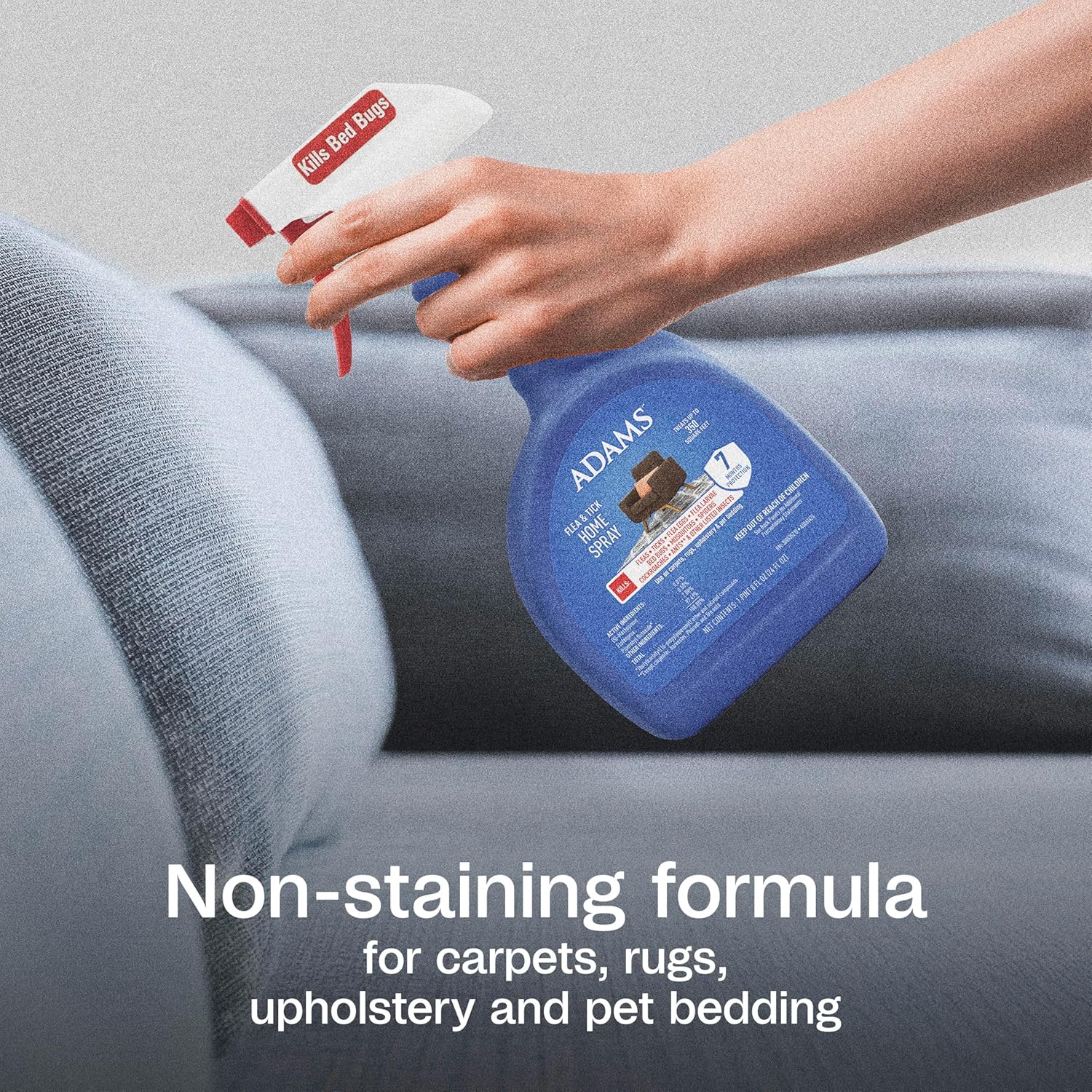Protect your home from invading pests with ADAMS Flea & Tick Home Spray. This effective flea and tick spray offers the protection you and your pets need so you can get back to doing what you love. Adult fleas can cause your pet discomfort and irritation, while their eggs fall off and develop in your home - making elimination of both stages critical. This spray delivers dual-action protection by killing over 30 listed insects and preventing new flea infestations. This formula breaks the flea life cycle, providing up to 7 months of protection. It also kills ticks, bed bugs, spiders, cockroaches, mosquitoes and more and kills fleas within 5 minutes. The easy-to-use trigger bottle makes application quick and convenient. Use it on carpets, rugs, upholstery, pet bedding and all surfaces of upholstered furniture inside your home. This is a fragrance-free and non-staining formula. The best protection you can offer your pet is protecting them and the areas where they live and play. Since only 5% of fleas live on your pet, use this spray with other ADAMS products to protect your pet, home and yard for complete pest control. Since 1975, the people who bring you ADAMS have helped owners confidently care for their pets, ensuring they live happy and healthy lives.