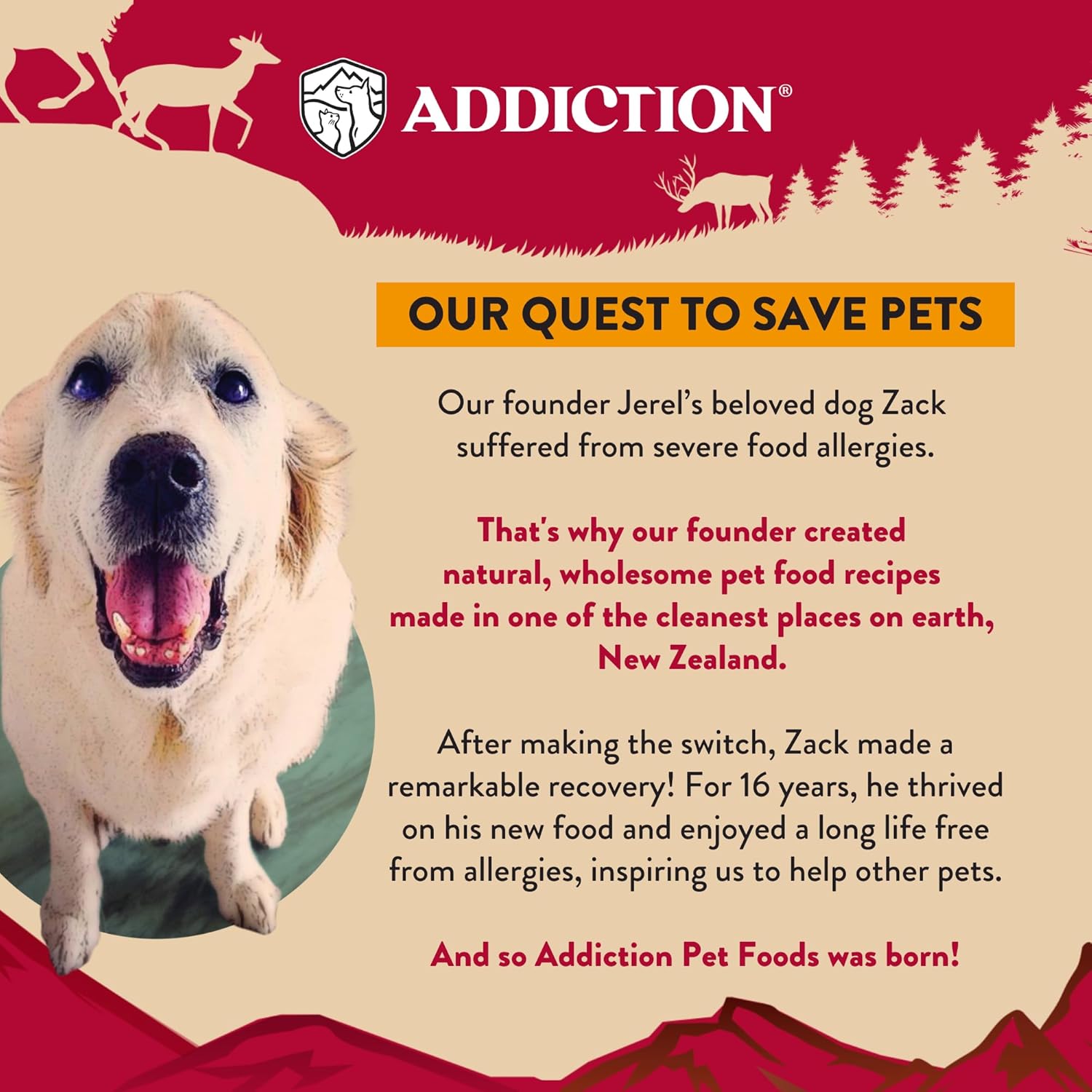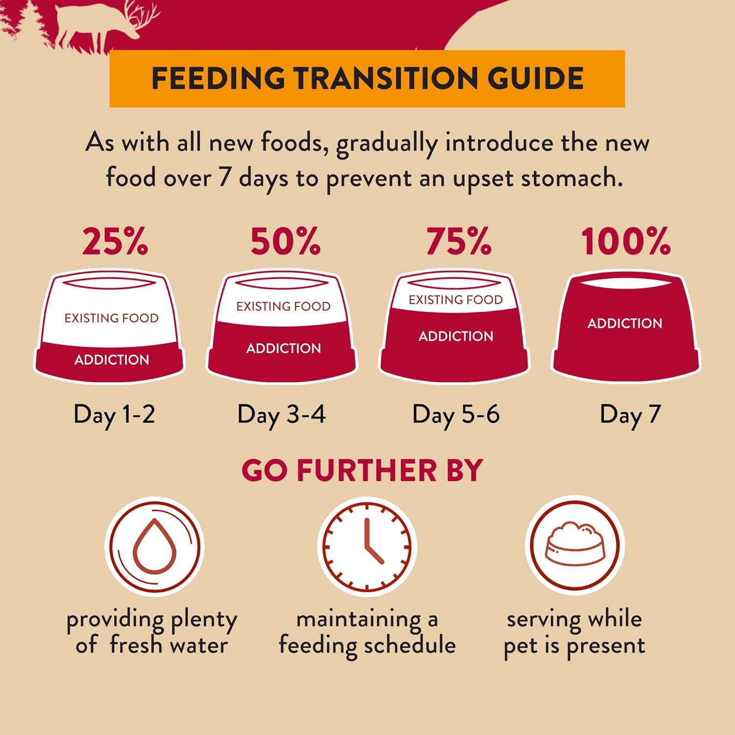 - Directions: Add 1 part of Addiction Homestyle Venison & Cranberry Dinner with 1 part of warm water. Add less water if thicker consistency is desired and stir well before serving. You need not wait for all the water to be absorbed. Once rehydrated, consume within for your alternatively, you can feed Addiction Homestyle Venison & Cranberry Dinner dry without rehydration. Keep fresh water available at all times.