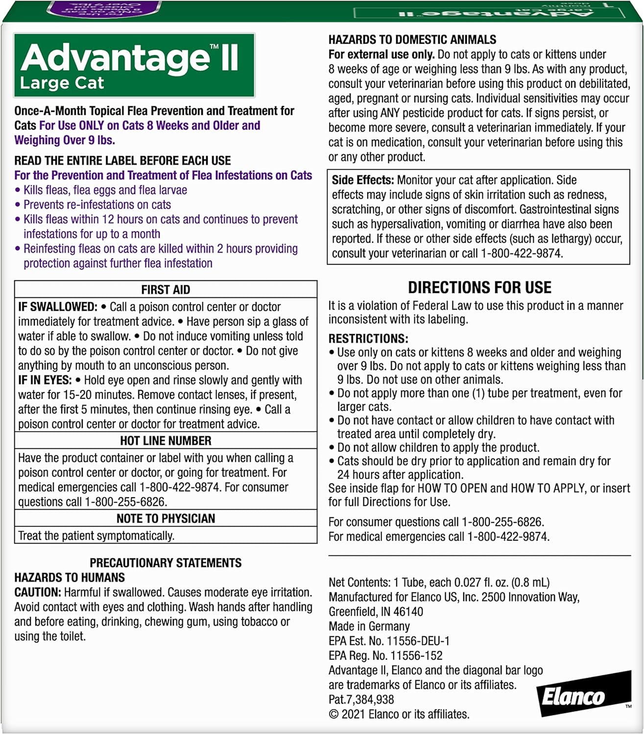 Advantage II Large Cat is a vet-recommended, leading brand in cat flea protection. Advantage II Large Cat flea treatment and prevention kills adult fleas, flea larvae and flea eggs to deliver total flea protection to your cat or kitten. Within 12 hours of application, Advantage II Large Cat topical treatment gets straight to work killing fleas through contact, so they dont have to bite your cat to die. This treatment works hard for 30 days following application, effectively breaking the flea life cycle, controlling existing flea infestations and preventing further infestations all month long. Fleas not only cause discomfort; they can also pose other health risks. Monthly use of Advantage II Large Cat is important to protect your cat against fleas that may cause transmission of tapeworms, Flea Allergy Dermatitis and flea bite anemia. That’s why Advantage II Large Cat makes applying treatment simple. This convenient, spot-on application goes on the back of your cat’s neck at the base of the skull. You’ll simply place the tip of the tube on the skin and squeeze the tube to expel the entire contents directly on the skin. It goes on in seconds! It's easier than a flea collar and there are no hard-to-swallow pills. You’ll also love that Advantage II Large Cat is fragrance-free and waterproof after 24 hours of application. Check the product label for information on application and potential side effects. Advantage II Large Cat flea protection is effective on both indoor and outdoor cats. Your cat should be at least 8 weeks old and weigh over 9 lbs. to use Advantage II Large Cat. For the ultimate convenience in care, Advantage II Large Cat is available over the counter – no prescription needed. And, you can stock up with a subscription for regular doorstep deliveries so you never miss a monthly treatment. Advantage II Large Cat is a trademark of Elanco or its affiliates.