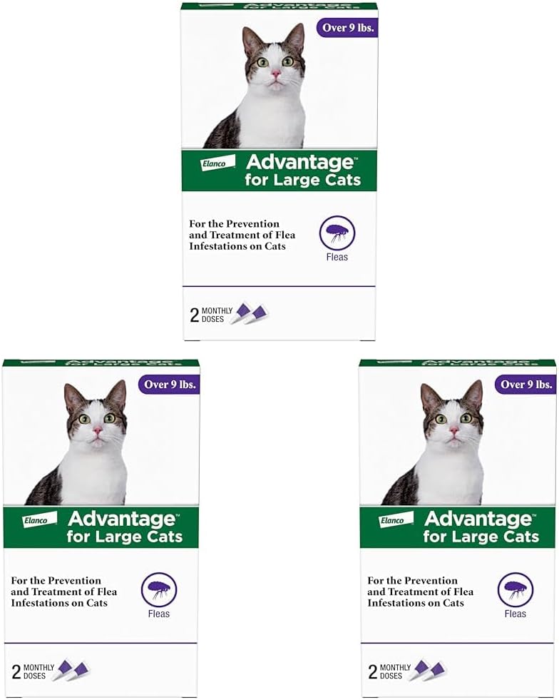 About this item The information below is per-pack only An excellent value from Advantage, a leading brand that has been trusted to protect cats from fleas for more than 20 years Advantage for Large Cats provides flea treatment and prevention for large cats over 9 lbs., at least 8 weeks of age Easy-to-apply monthly topical treatment – no hard-to-swallow pills Same-day effectiveness – kills fleas within 12 hours of application and keeps working for 30 days Fragrance-free and waterproof formula › See more product details