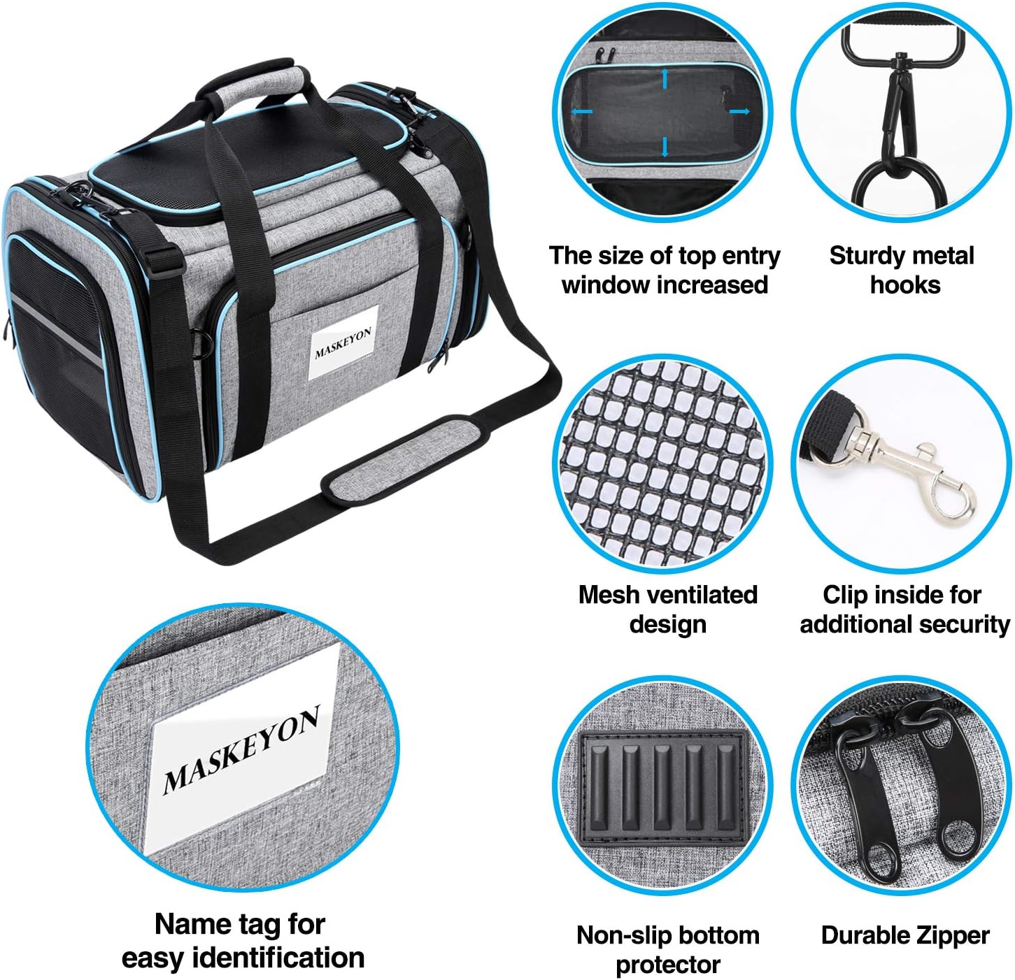 100% SATISFACTION GUARANTEED:We are sure that your pet will love our full-featured pet travel carrier.But if dont like it for any reason,you can return it freely and full refunded. Details of Maskeyon Airline Approved Pet Carrier: Fabric:Waterproof Cationic Oxford and High Density EVA board,it is non-toxic and odorless. Recommend Pets Weight: 20 lbs (about 9kg) Dimensions:19.5x12x12 inches (LxWxH) Color: Grey & Blue Zipper: metal slider,all zippers are anti-escape. storage pockets:2 front pockets+ 1 sided mesh pocket Name tag: put name in this tag for easy identificaiton to the vet Features: 1,top openning and 4 breathable soft-sided Extensions make it a good ventilation,and allow your pet to see outside much better.We increased the size of the top entry window for easier access. 2,Maskeyon pet carrier backpack has 3 entrances, easy to access. Unzip top entrance, pet can poke their head out 3,The mesh sides are strong! your cat dog will not be able to claw or chew her way out. 4,The fleece pad can be kept in place with velcro,and it would cover the 2 expanding foldouts, which makes your pet experience better 5,Non-slip bottom protector makes it safer when you put the carrier in a Smooth ground,such as under the airline seat 6,It's collapsible, unzip the zippers and fold it down into a flat package for easy storage 7,The Maskeyon pet carrier is lightweight but sturdy.Your puppy will keep calm down in our firm-bottomed carrier 8.This soft sided pet carrier bag is good for going to the vet or the car, travel,airplane ect. 9,TSA AIRLINE APPROVED: Designed to comply with TSA and IATA requirements. 10.Designed with reflective tapes on both sides, the mesh pet carrier is visible at night , increase safety of your pet during night trip. Package Contains: 1 x Maskeyon Pet Carrier 1 x Removable Soft Pad 1 x Removable Shoulder Strap