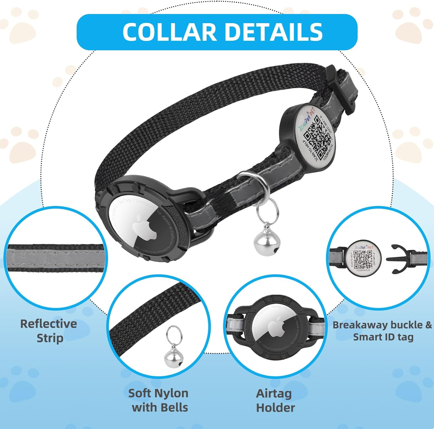 About this item Different from other cat collars, our integrated AirTag cat collar is more cost-efficient, no need to buy Air tag Holder and QR tag separately, this collar can meet all your needs. Unlike other separated AirTag cases, our Air Tag cat collar fits the Apple AirTag perfectly, protect your AirTag device and prevent AirTags from falling off or dangling. (Note: AirTag is not included) This cat AirTag collar are designed with a secure Break away clasp which will quick release during outdoor emergencies. And highly reflective design allows you to spot your cat whether it's day or night, this makes it safer for cats to chase or play outside. If someone scans the QR code, strangers can scan the code to check the phone number you left, or send address to your email, keep you stay informed and locate your pet quickly. Free online pet page prevent lost, No Subscription or Any Other Fees! This kitten collar is made of well-sewn nylon that won't scratch your cat's skin, your cat won't feel any discomfort even when wearing it for a long time as the lightweight design, and the bell is removable if needed. › See more product details