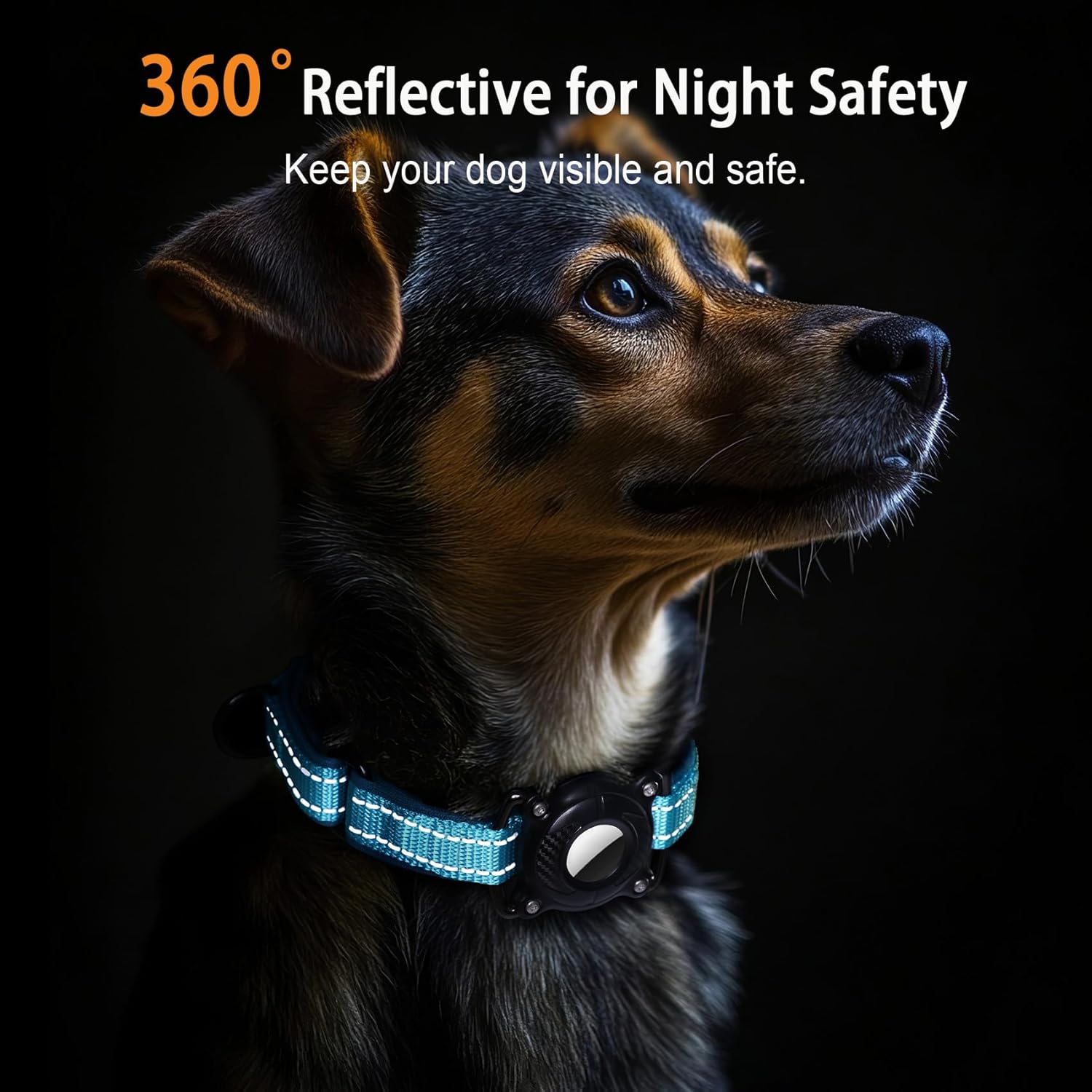 About this item --This airtag dog collar is designed to perfectly fit Apple AirTags,eliminating the need for an additional AirTag holder.Easily track your pet and keep them safe without the hassle. --Featuring a martingale collar design,this collar is ideal for dogs who tend to pull or slip out of regular collars.The Martingale feature gently tightens when the dog pulls,providing better control without discomfort or choking. --Made from durable nylon,this dog collar with airtag holder is built for active dogs of all sizes.The soft,breathable padding ensures your pet stays comfortable all day,while the adjustable fit guarantees a perfect fit around their neck. --The IP68 waterproof airtag holder is fully enclosed, protecting your AirTag from water,dust,and dirt—no worries about weather or outdoor conditions affecting the device. --With a quick-release buckle and double-lock feature for emergencies,plus a 360° reflective strip for nighttime visibility,this reflective dog collar offers complete safety and peace of mind for both you and your pet. › See more product details