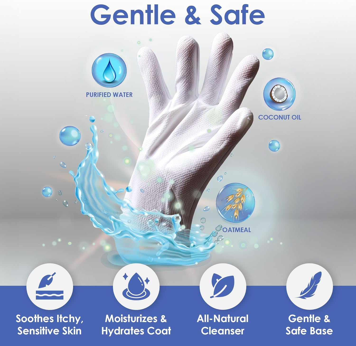 - Directions: Remove one bathing glove from the pack and gently wipe your pet’s coat, starting from the head and moving down to the tail. Use circular motions to lift dirt, dander, and odor while distributing the coconut scent. No rinsing is needed. Suitable for quick cleanups, in-between baths, or while traveling. Avoid contact with eyes and inside ears. Dispose of the used glove in the trash after use. Do not flush.