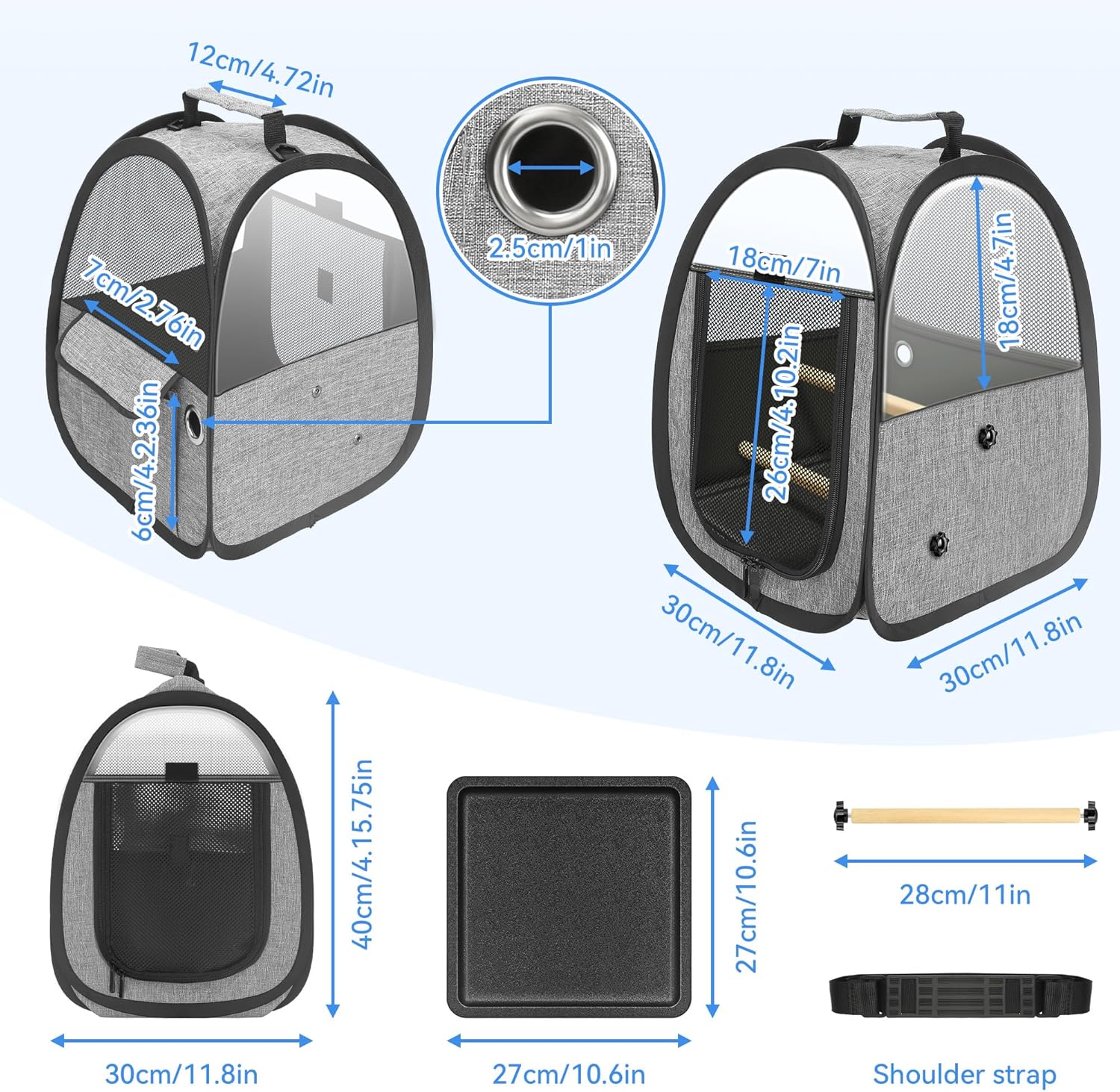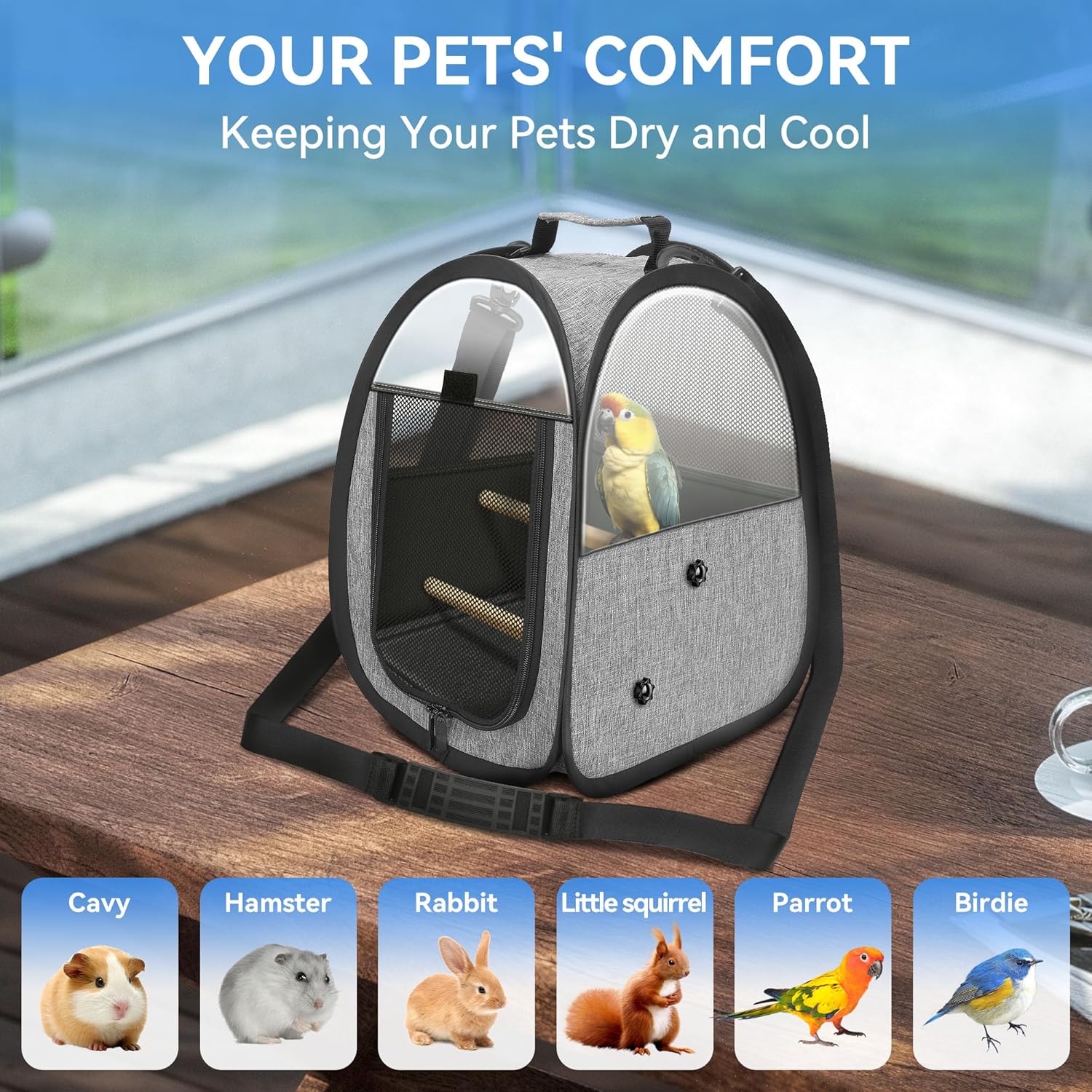 About this item 【Easy to Install & Store】 The bird carrier is with wooden perches, allowing your bird to move inside, easy to install, you only need to fix screws. Easy to fold, convenient to store when you don’t need to use it 【Convenient & Easy to feed】 With side pockets, convenient to put some small items. There is a small hole for you to feed your birds, no need to open the entrance to prevent birds from escaping 【Unique Design】 The mesh design ensures adequate air flow. With transparent sides, it can provide your birds with wider field of vision, and it is also convenient for you to check their well-being at any time 【Easy to Clean】 The bird cage comes with a high-quality plastic bottom tray, which is easy to disassemble and clean 【Lightweight & Portable】 Size: 12.2 x 12.2 x 15.5 inches(L*W*H). With handle and a shoulder strap, easy to carry, perfects for outdoor activities or travel. Recommended for Small size birds › See more product details
