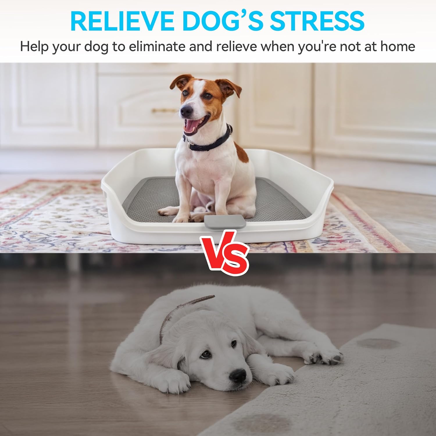 About this item Indoor Dog Potty with Raised Walls: The dog potty tray is thoughtfully designed with raised walls on sides, effectively containing splashes and keeping urine from spilling out. It creates a safe, clean space for your dog to eliminate, especially when you're not at home. The high walls ensure that any accidents are confined within the potty, reducing the chances of messes on your floors or furniture. Safe with Shed-Proof Design: The double layer design features a perforated grate that allows urine to flow directly down to the pads underneath, preventing your dog from chewing it and tracking it around the house. It's compatible with 24x24 inch pee pads (not included), making it easy to find and replace the right size. Easy to Clean and Maintain: Cleaning this dog toilet is a breeze. The design allows for quick pad replacement, and the frame is easy to wash. The puppy potty also includes a removable pee post, providing a convenient target for male puppies to aim at, helping them develop good habits. Large Space for All Dogs: This dog litter box sizes 24.8''X24.8''X6'' which is tailored to meet the needs of all size dogs, making it a reliable solution for potty training new puppies or assisting senior dogs with bladder control issues. Convenient and Practical Solution: Designed with convenience in mind, this dog litter box integrates seamlessly into any home environment. The combination of durable construction, raised walls, a perforated grate, and easy-to-clean features makes it a practical addition to your home. It not only helps with training and managing accidents but also provides a long-term solution for maintaining a clean and mess-free space. › See more product details