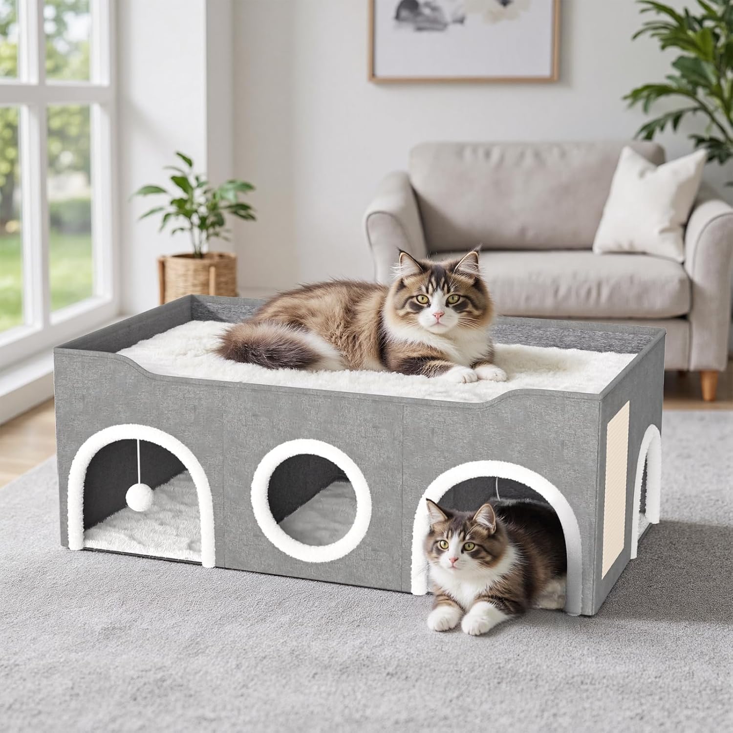 All-in-1 Extra Wide Cat House,Top Bed Three rooms Cat Condos,Cat Beds for Indoor Cats,Multi Cats Puppy Family with Fluffy Ball Hanging and Scratch Pad, Foldable Hideaway