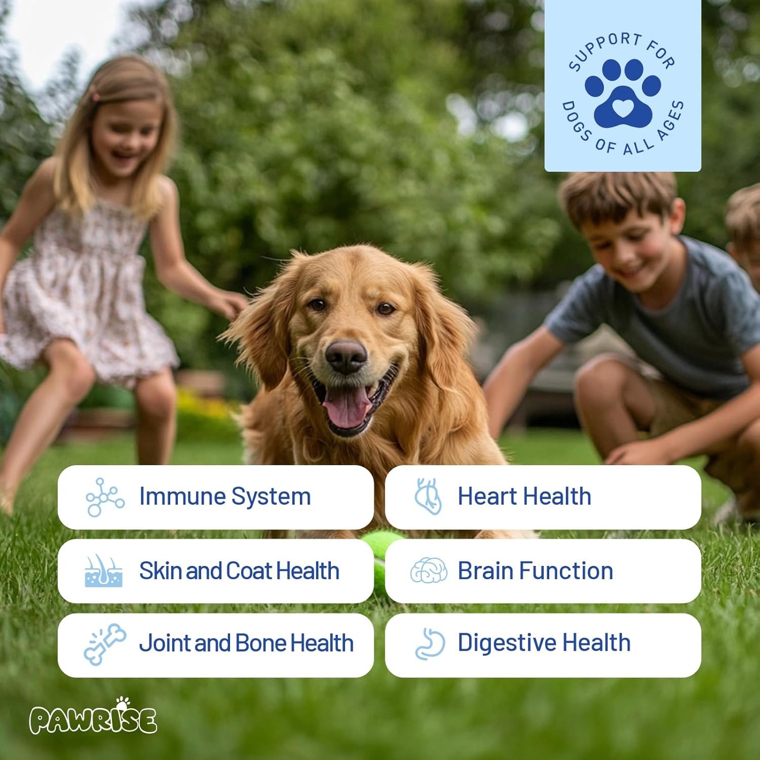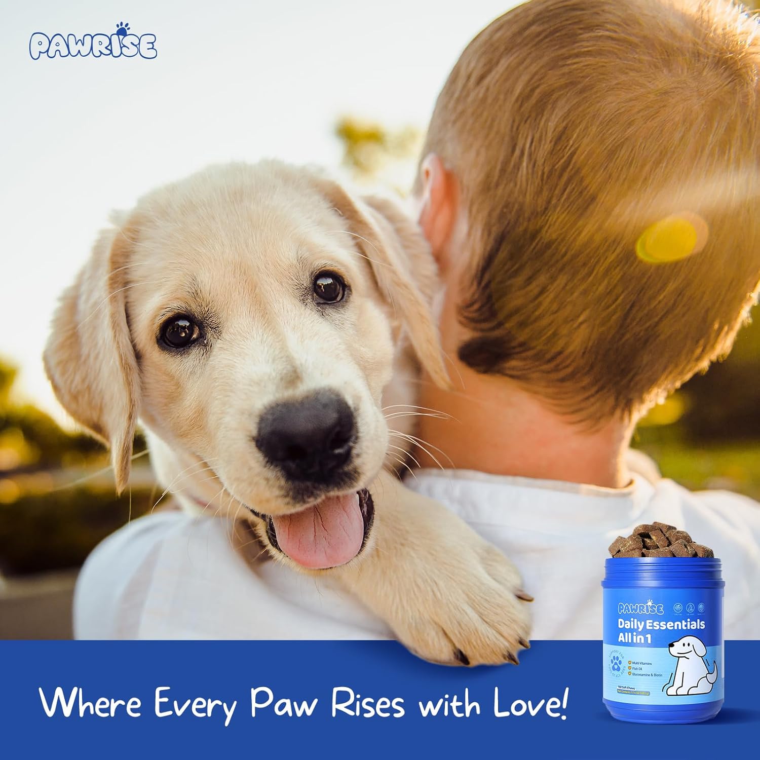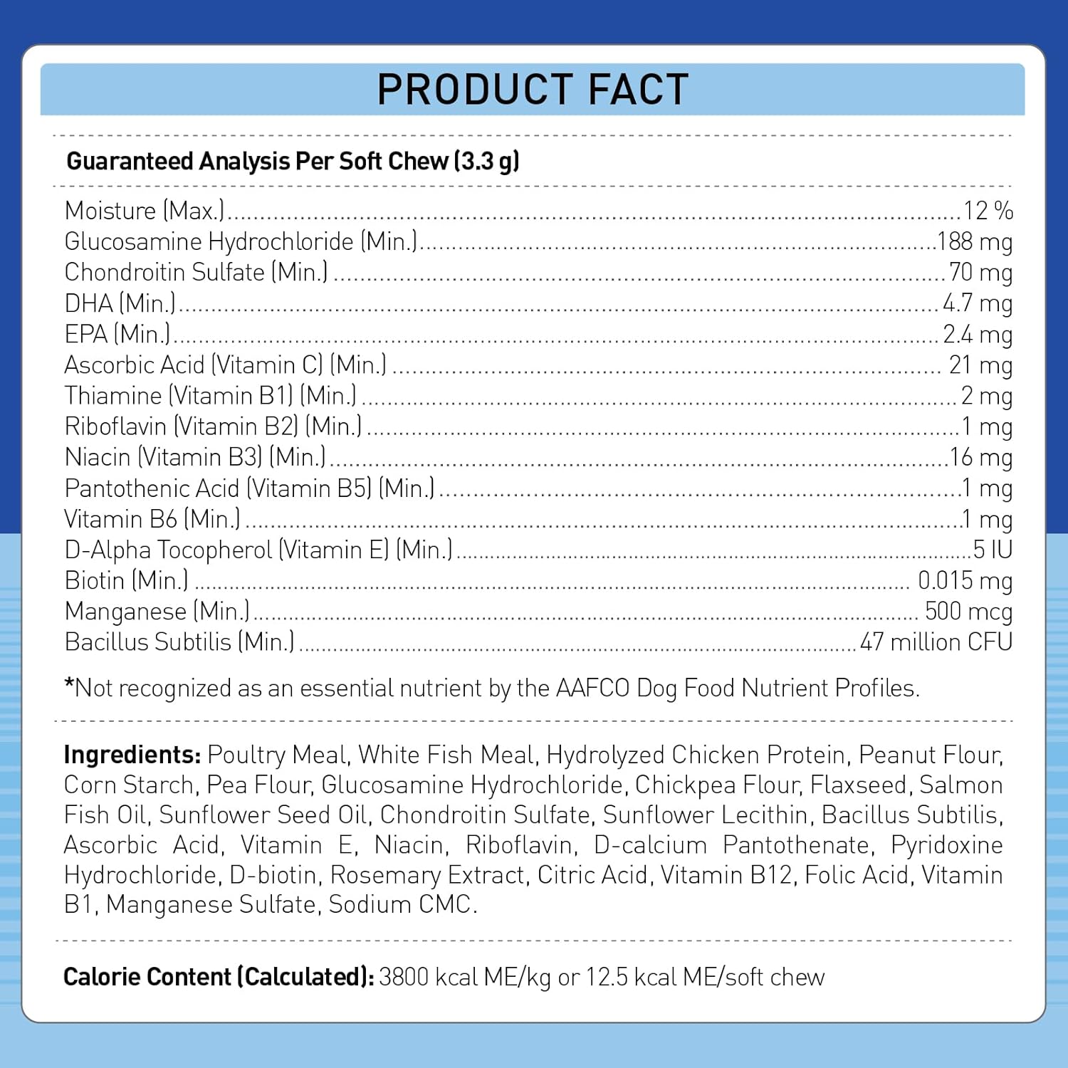 About this item 𦴠Joint & Mobility Care β Glucosamine, Chondroitin, and MSM support flexible joints and strong bones, helping your dog stay playful and active at every age. β¨ Skin & Coat Health β Omega-3 fatty acids and Biotin nourish your pupβs skin and coat from within, reducing dryness, itching, and shedding. π Digestive Balance β Natural prebiotics and probiotics promote a healthy gut flora, improving digestion and nutrient absorption. π‘οΈ Immune & Energy Support β Vitamins A, B, C, and E help strengthen natural defenses, keeping your dog healthy and full of life. πΊπΈ Vet-Formulated & Made in USA β Delicious chicken-flavored soft chews crafted in the USA under cGMP standards β safe, tasty, and loved by dogs. βΊ See more product details