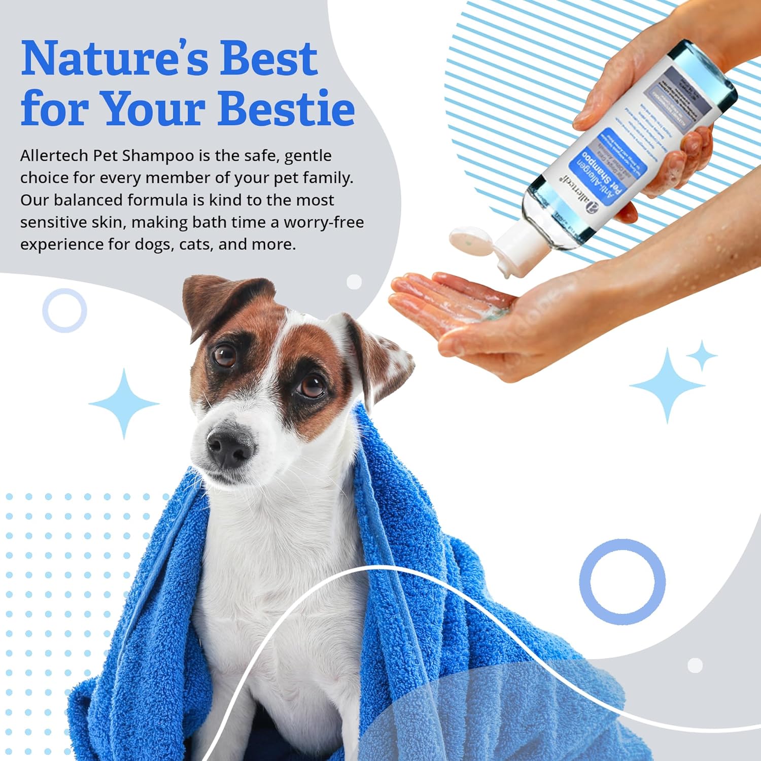 - Directions: Wet your pet's coat thoroughly with water. Apply a small amount of AllerTech® Anti-Allergen Pet Shampoo and gently work into animal's coat. Rise with clean water. Towel dry or blow dry animal's coat.