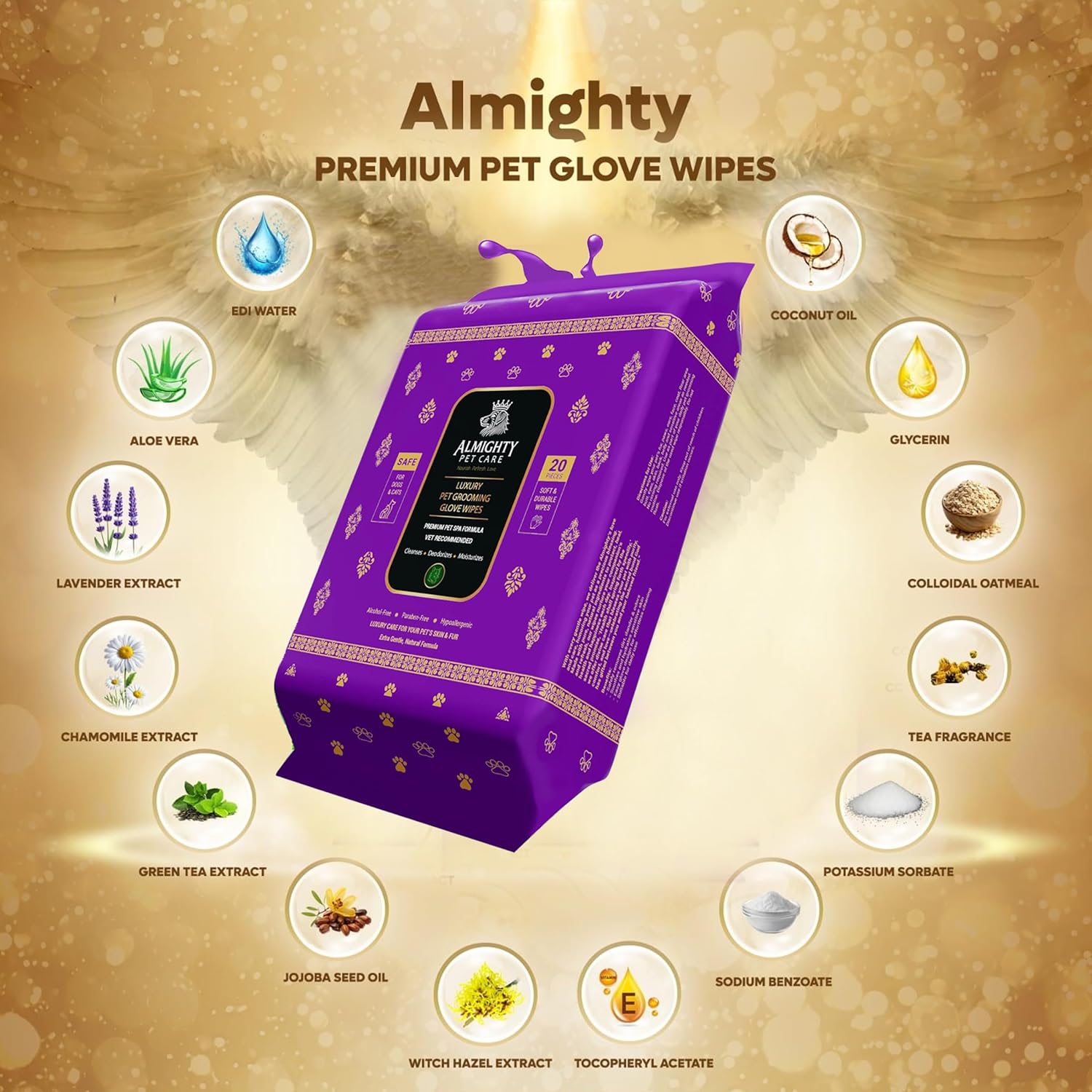 🌿 Five-Finger Luxury Grooming Glove – Deep Clean & Gentle Our glove-style wipes clean 3× better than regular flat wipes, reaching fur, paws, face, ears & sensitive areas. Works as dog bath wipes and cat cleaning wipes, perfect for quick grooming at home or on-the-go. ✨ Enriched with Natural Ingredients for Healthy Skin & Coat Infused with Aloe Vera, Chamomile, Coconut Oil, Jojoba Oil, Green Tea, Oatmeal & Vitamin E for hydration, shine, and softness. Leaves your pets fresh, nourished, and lightly fragranced with lavender scent. 🐾 Hypoallergenic & Safe for All Pets Gentle enough for puppies, kittens, seniors, and pets with sensitive skin. Alcohol-free, paraben-free, dye-free. Ideal for daily grooming, post-surgery cleaning, or quick clean-ups. 🧼 Cleans, Deodorizes & Moisturizes – No Rinse Needed Effortlessly removes dirt, dander & odors while keeping skin soft. Functions as dog bath wipes, cat bath wipes, and glove wipes for bathing, perfect for travel, outdoor walks, or playtime messes. 🚗 Travel-Friendly, Compact & Resealable 20-count resealable pack keeps every wipe moist and fresh. Ideal for home, car, vet visits, vacations, or daily walks. Convenient, portable, and ready anytime your pets need quick pampering. › See more product details