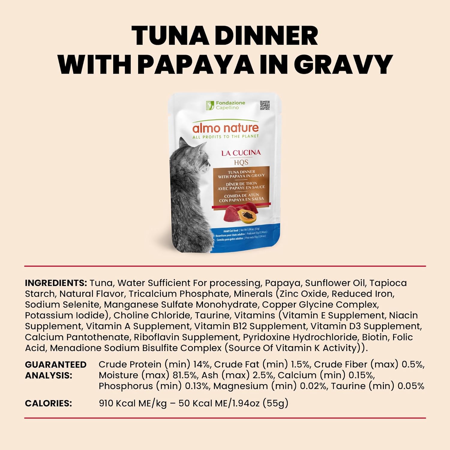 Elevate your cat's dining experience with this complementary Almo Nature bundle featuring both canned and pouched wet food varieties. The bundle includes a 12-pack of 2.47oz cans offering a rotation of Atlantic Tuna, Mackerel, Trout & Tuna, and Chicken & Shrimp flavors, paired with a 12-pack of 1.94oz pouches of Tuna Dinner with Papaya in Gravy. This thoughtfully curated combination provides your cat with diverse protein sources and textures to keep mealtime exciting. The canned varieties offer a selection of fish and seafood in broth, while the pouched meals feature tender tuna with papaya in a savory gravy. Both products are crafted with human-grade ingredients and maintain Almo Nature's commitment to premium quality. The grain-free formulations work together to support cats with sensitive stomachs, while the high moisture content in both products helps promote proper hydration and urinary health. The varied textures – from the broth-based canned foods to the gravy-rich pouches – cater to picky eaters and provide different dining experiences throughout the week. Made without artificial additives or preservatives, both products feature easily digestible proteins and essential nutrients that complement each other to support your cat's overall well-being. This bundle represents Almo Nature's dedication to natural, limited-ingredient nutrition while offering your feline friend a diverse menu of premium wet food options.