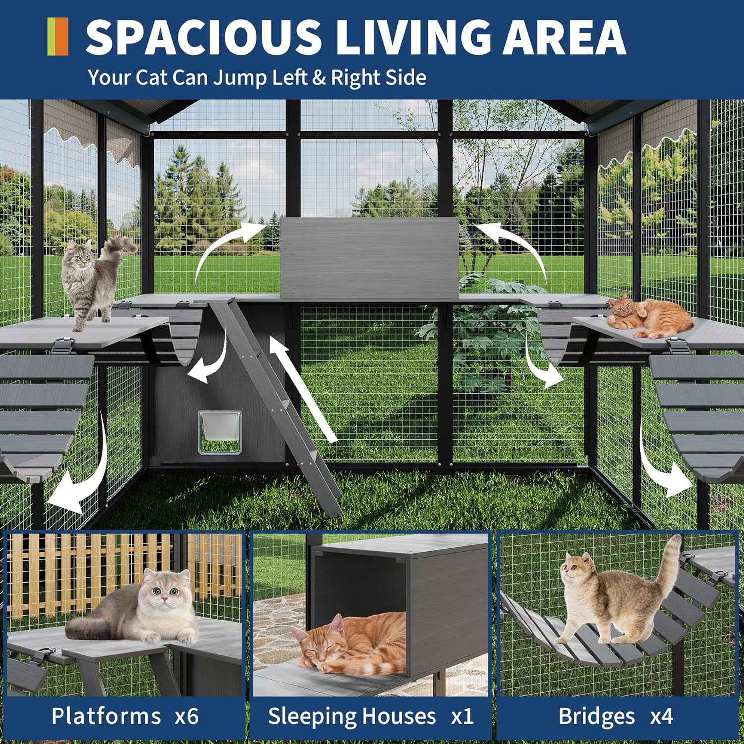 About this item Enhanced and Robust Aluminum Build: This expansive aluminum cat walkway is crafted to house several pets. Its sturdy aluminum frame outshines solid wood in durability and is rust resistant. The added on galvanized wire mesh, with a mere 0.5" wire opening, along with the sliding bolt locks on the doors, safeguards your cats indoors. It's a secure and reliable structure for feline friends UNIQUE CAT ENCLOSURES - Our unique extra large catio comes equipped with 2 Channels, 6 Comfortable Platforms, 1 Huge and Spacious Condos, 1 Lockable Doors, and a UV-proof cover. The 4 bridges allow your cats to indulge in jumping and climbing activities, while the 5 walkways meet their needs for walking and leaping. The resting houses provide a cozy spot for them to nap in the sun. These features fully satisfy your cat’s natural instincts to jump and climb, and the walkways enable them to move SPACIOUS ACTIVITY AREA - With Large catio outdoor cat enclosures, this setup offers ample space for multiple cats to play, lounge, and relax. The overall dimensions are 70" L x 95" W x 76" H. There's plenty of room for you to join your pets or simply sit back and enjoy watching them frolic in their new favorite spot Versatile Door Adjustments: Each of the two small doors has four adjustable modes: fully locked, free access, one way entry, and one way exit. This design gives cats more ways to explore while ensuring their safety. It's a smart feature that balances freedom and protection All-weather Protection Cover: The cat patio has a thick Oxford cloth cover. On sunny days, it provides shade, keeping pets healthy and hydrated. It's water resistant, so the enclosure stays dry in the rain. It shields cats from wind, rain, and snow, creating a cozy and safe environment no matter the weather › See more product details