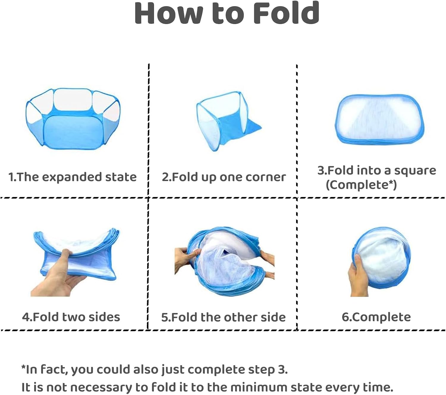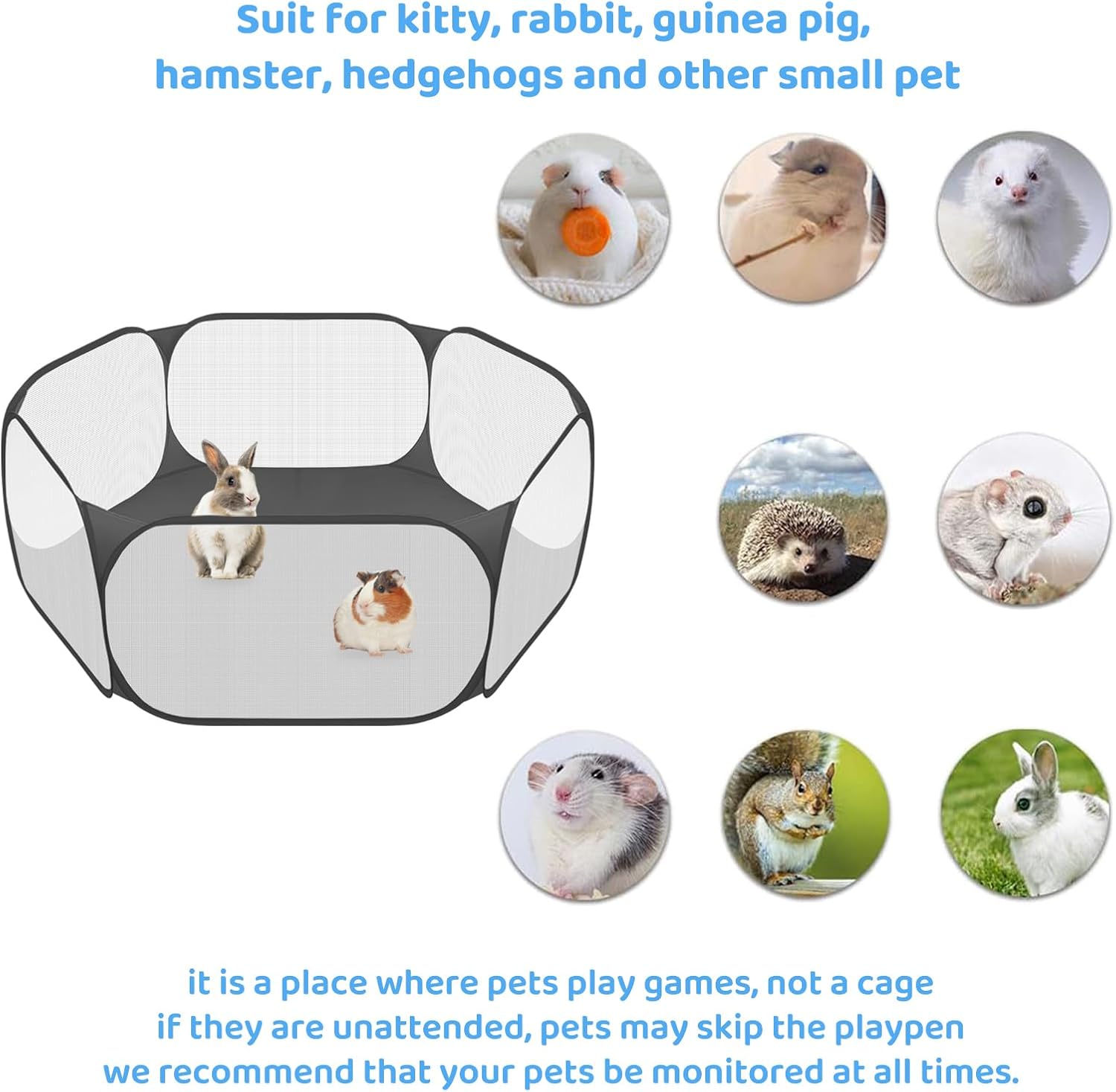 About this item 【Transparent & Breathable】Surrounded by nets, you could watch your pets at all times, as well as ensure the ventilation of the playpen. 【Automatic Opening】No need for complex splicing, built in frame, opened in seconds. Folds back flat when not in use for easy storing. When it is opened under spring pressure, it should be away from children and face. 【Outdoor/ Indoor】The Pet Exercise Fence is easy to carry, and you don't need to carry a huge cage when you take your pet out. It can limit the range of pet activities (It may not be suitable for pets with jumping, climbing and biting habits). 【Size & Material】Width & Height after expansion 47 in*15 in (120 cm*38 cm), 10sq.ft; Durable polyester fabric, easy to clean. 【Suitable For】Small animals pet playpen, suitable for hamsters, chinchillas, guinea-pigs, gerbils, ferrets, squirrel, bunny, reptile or other small animals. › See more product details