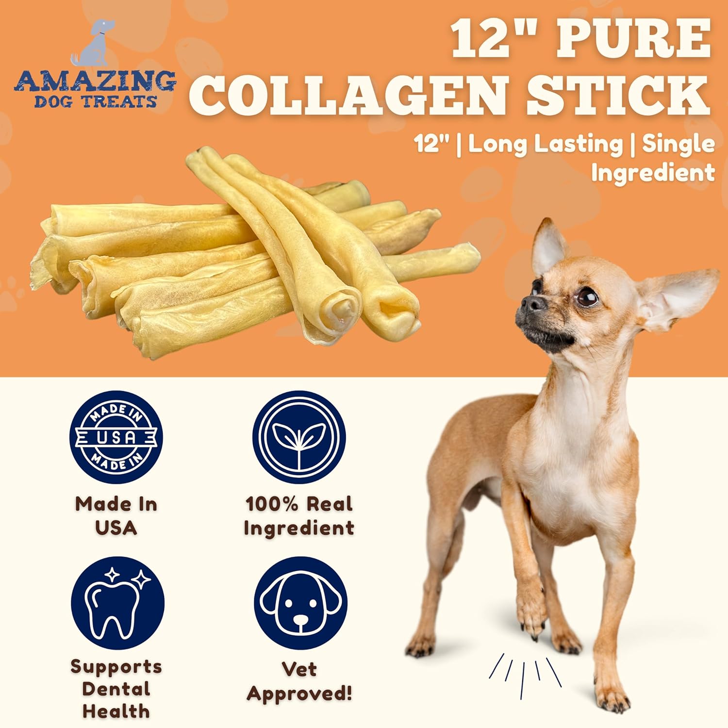 About this item BEST RAWHIDE ALTERNATIVE: Collagen Bully Sticks are the best Rawhide Alternatives you can find. Most rawhides are overly processed using chemicals or preservatives and are very dangerous for your dog to consume. Collagen Bully Sticks are high in protein and will not cause harmful stomach blockages like rawhide can. COLLAGEN BENEFITS: Collagen Stick Dog Chews can assist your dog’s body when digesting collagen chews with their naturally occurring peptides and amino acids. Collagen peptides can improve joint health by increasing mobility in your pups movement. Additionally, they assist with bone density and shinier coats. PREMIUM SELECTION: As a pet owner we know we want only the BEST treats for our canine companions. At Amazing Dog Treats we produced and packaged only the HIGHEST QUALITY and HEALTHIEST treats PROMOTES HEALTHY TEETH: All Amazing Dog Treats products offer stimulation of the gums, and teeth which release natural brain chemicals which produce enjoyment for your dog. Our treats and chews help maintain canine dental health by removing plaque with a tasty treat, while allowing your dog to use every part of their mouth to chew, and floss away tartar with all natural single ingredient dog treats. EASILY DIGESTIBLE: Our treats and chews are single ingredient natural treats made directly from Free Range cattle or lambs which can be easily digested unlike chemically processed rawhides, and other treats loaded with sugars, and additives. › See more product details