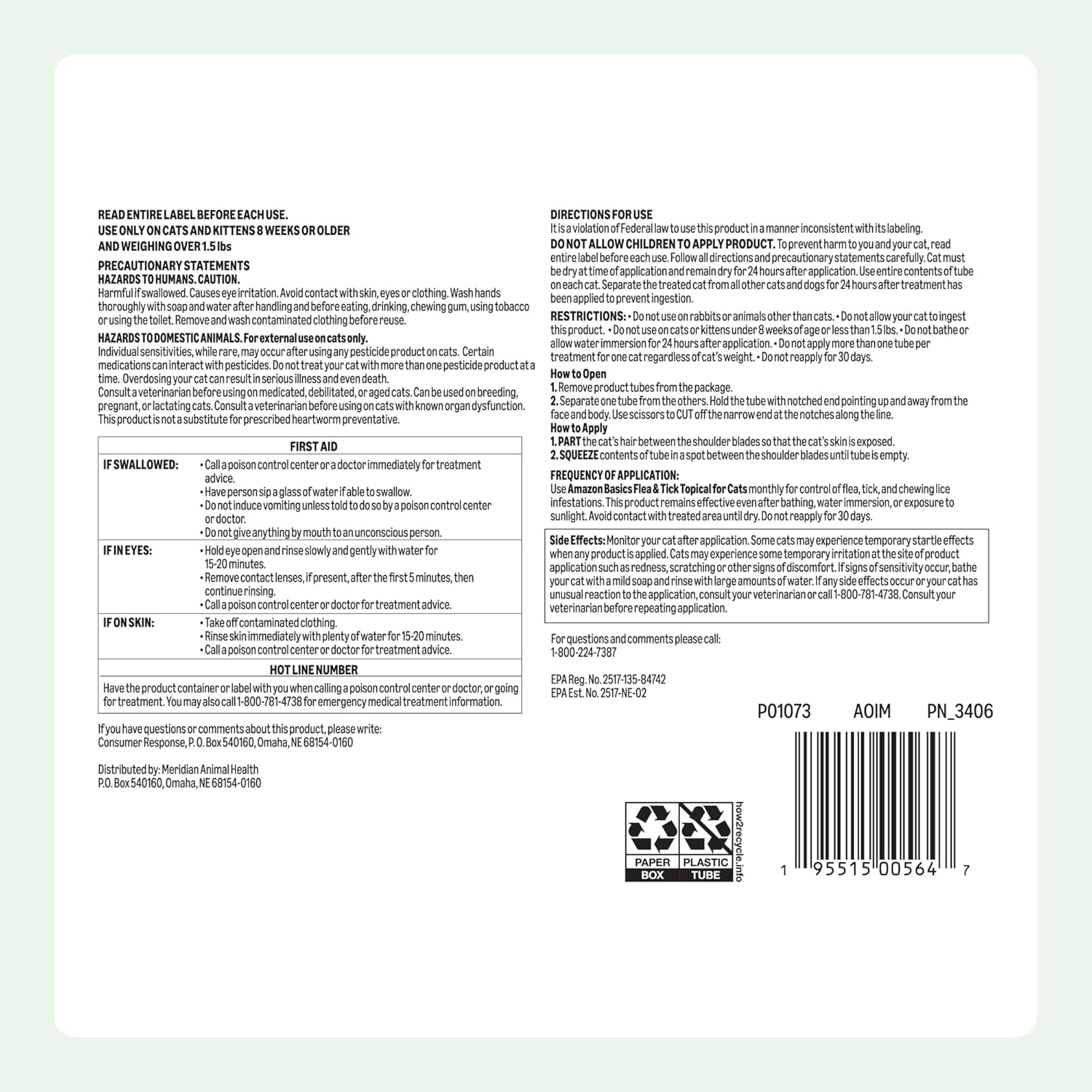 Amazon Basics flea and tick topical for Cats kills fleas, flea eggs, flea larvae, ticks and chewing lice. The fast-acting, long-lasting treatment is formulated to protect your cat against dangerous pests. It breaks the flea life cycle by killing flea eggs and larvae. For best results, apply once a month to protect your cat from fleas and ticks.