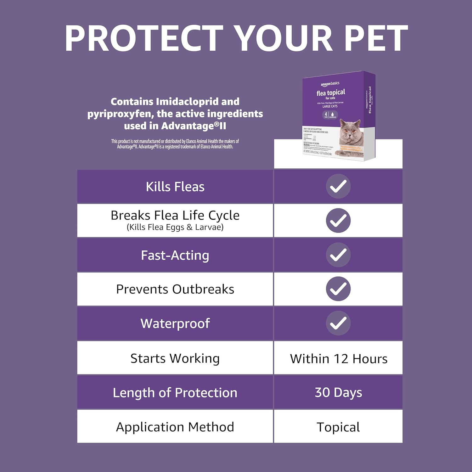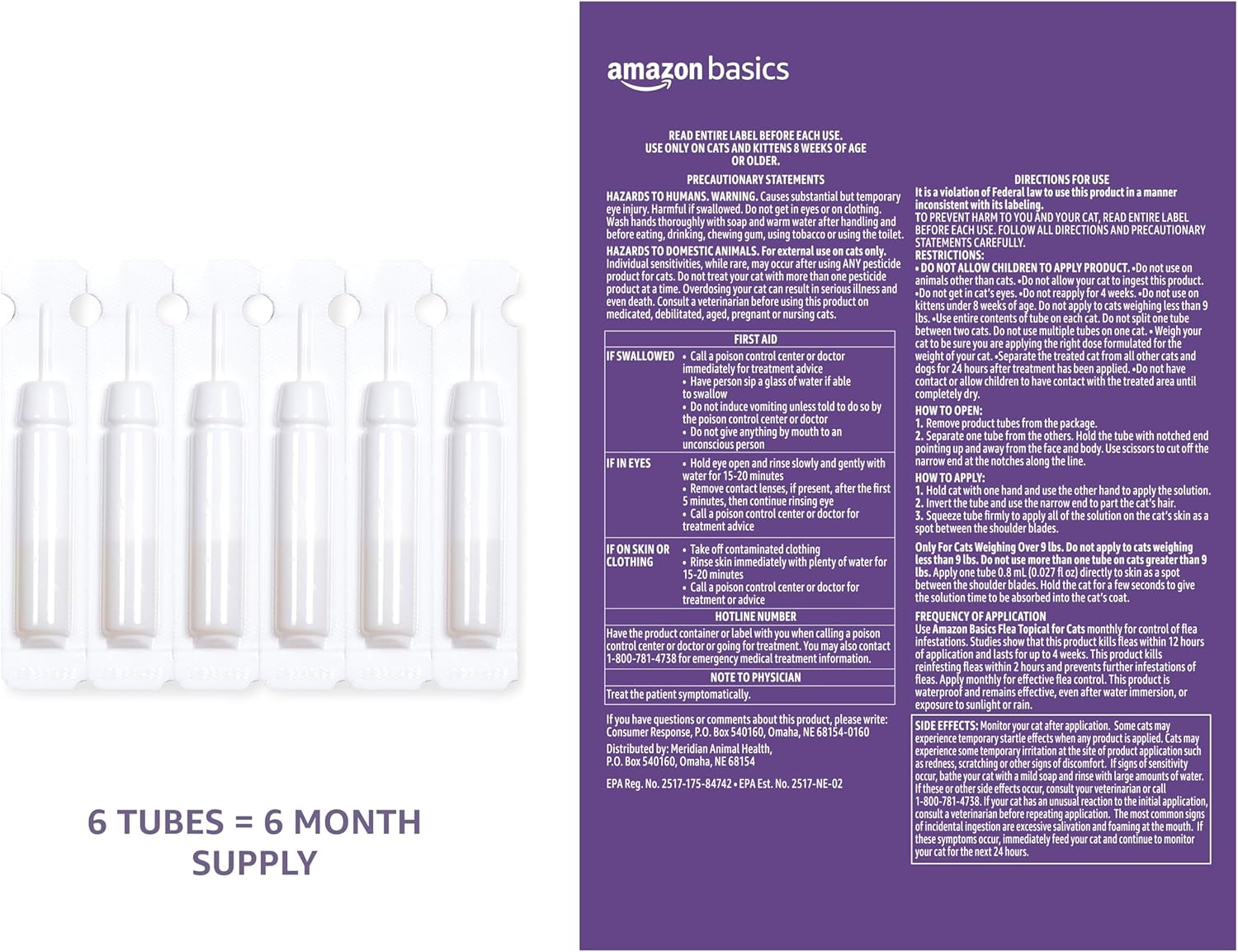 Product Description SUITABLE CAT FLEA MEDS FOR LARGE CATS: Specifically formulated for cats weighing over 9 pounds, offering targeted flea control with our dedicated cat flea meds for your furry companion. From the Manufacturer Amazon Basics