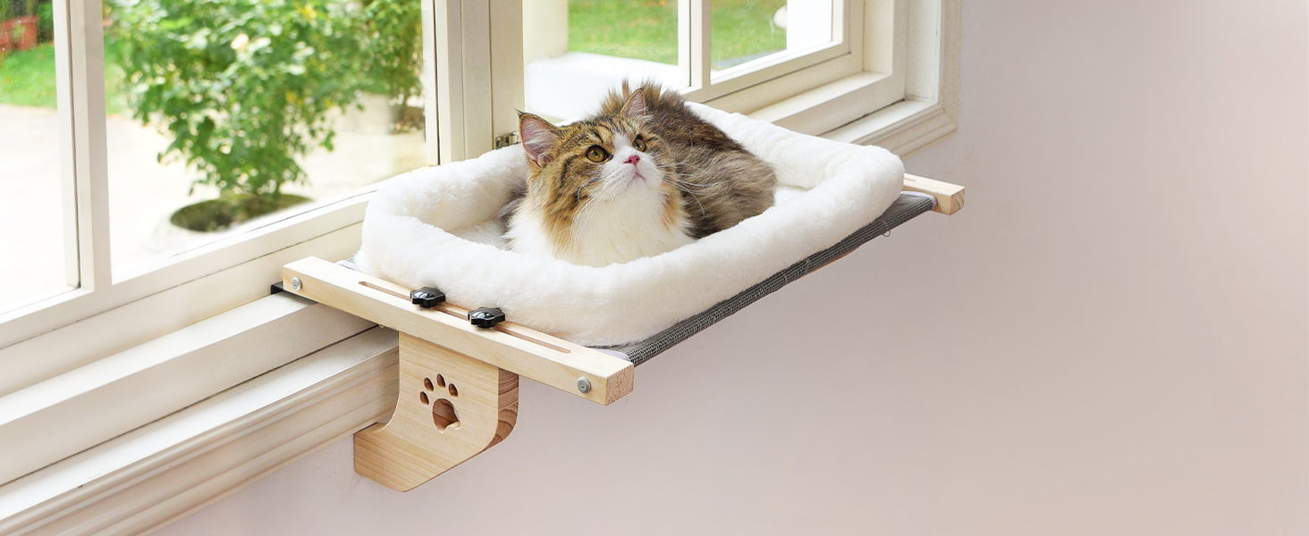 About this item Comfortable Cushion Bed Cover: This cat window perch is upgraded with thickened fluffy cushion bed cover, which give cats more comfort and safety while sleeping on it. The cover is made of soft plush fabric and cotton, perfect for keeping warm. Let your cats feel more comfortable while lying in this resting seat. It is of Velcro tape design, easy to remove for wash. Simple Assembly & Adjustment: The assembly of this cat window hammock is easy that only a few steps are taken to set it up. After the assembly is complete, you just need to screw the thumb screws to adjust the distance between hooks and supports to fit the thickness of your window sill. Avoid the hassle of twisting the screws with a wrench for each time. No Drilling & Suction Cups Needer for Installation: This cat bed is fixed on the carrier by two metal hook and supported by two wooden supports, without the need to damage the wall and the worry of the suction cups falling off. The metal hooks are widened. The contact surface with the windowsill is larger that protects your window from being damaged by the concentrated force. Large Space Cat Window Perch: The size of the medium cat sill window perch is large enough for large cat. The main frame of this cat bed is made of thickened wood and hard metal. It is of great safety that it can holds up to 40lbs firmly on the window. Wide-range Use: AMOSIJOY cat bed is design for using on window sills. Cats can enjoy sunbathing and watching outside on it. It can also be placed on the bedsides, allowing you and your cat to accompany each other and keeping cat hair from getting all over the bed. Drawers, cabinets would also be the applicable places. › See more product details