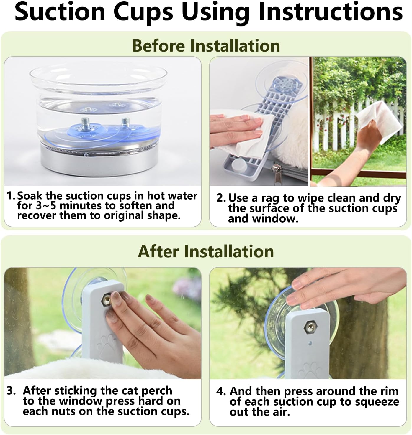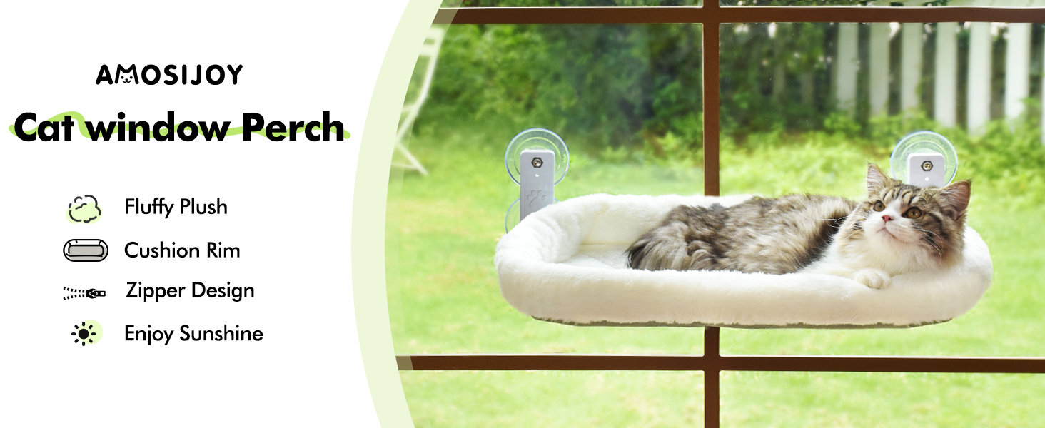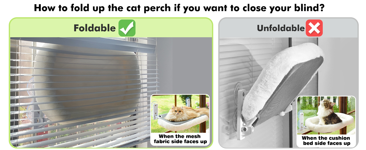 About this item Comfortable Cushion Bed Cover: This cat window perch is upgraded with thickened fluffy cushion bed cover, which give cats more comfort and safety while sleeping on it. The reverse side is breathable sandwich mesh. You can change the cover at any time by the zipper. Both of them are bite and scratch resistant, with no chemical smell. The cloth cover is also removable for wash. Cordless Cat Hammock:Cordless cat hammock, let your cats freely jump up and down among several beds without being stumbled by rope in support frame. This cat bed is provides enough space for cats. The dimension is 23.3’’x11.2’’x7.8’’ (includes the suction cups in length), fitting window of 23.3 inches at least, please measure your window before ordering. Note of Foldable Function: This cat window perch is unfoldable when the cushion bed side of the cover facing up, and it is foldable when the mesh fabric side facing up. If you want to fold it up to close your blind, you could flip the cover so that the mesh fabric side facing up, and then fold it up. In this way, you can freely close or open your blind without interference. Strong & Sturdy Frame: Its frame is made of paint stainless steel material and connected by hardware, durable and steady from sun and wind, no distortion and no break. The cat bed is with strong bearing force, supporting up to 40lbs. 360° Window Perch: Cats love warmth, it is ideal for them to bask under the sun, enjoying sunbathing. They can also enjoy climbing up to the hammock and down, getting a 360° full view of the surroundings. On a sunny afternoon, enjoy languid hours with the dozing cats. › See more product details