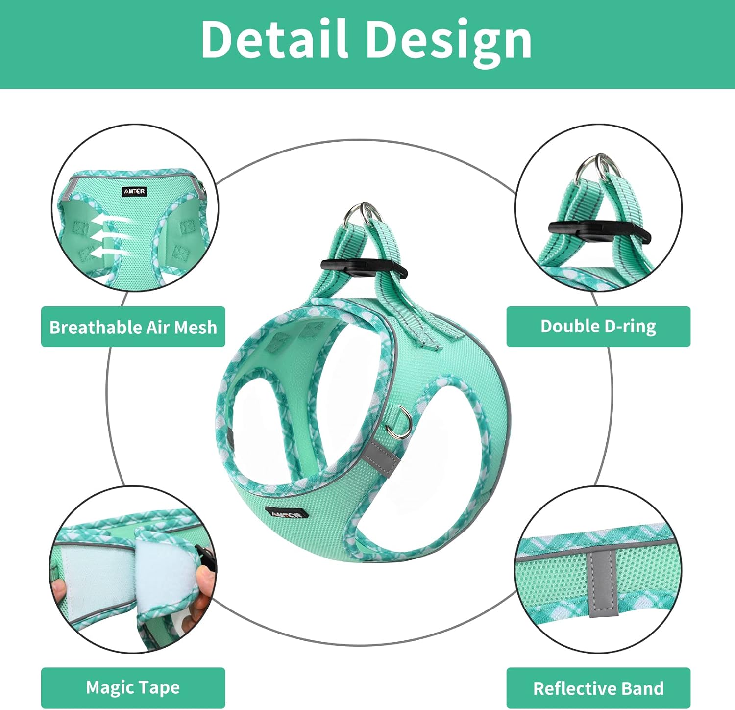 About this item No Pull, No Choke - The no pull dog harness and Leash Set has two D-rings, easy links to traction rope hooks, not easy to swing, prevent suffocation and pull.Padded design reduces tugging and pulling on your dogs and cats neck Reflective dog harness - AMTOR small dog harness with Magic Tape,buckle and double D-rings work together protect your pet in three layers of security. The 360° highly reflective strips provide good visibility in the dark Breathable Air Mesh - The dog harness is made with soft mesh fabric,which is high-density, soft and comfortable, and can prevent chewing or tearing.The dog harness suitable for extra-small/small medium large dogs and cats Dog Harness and Leash Set - The dog harness is equipped with a traction rope of the same color, and a comfortable cushion cotton is added to the handshaking part of the traction rope to prevent the hand from being injured due to excessive tension. It is convenient, beautiful and comfortable Easy to Use - The dog harness for small dogs no pull can be easily put on or off in just a few steps. just put their front feet into the hole,close the hook and loop fastener and snap the buckle,finished › See more product details