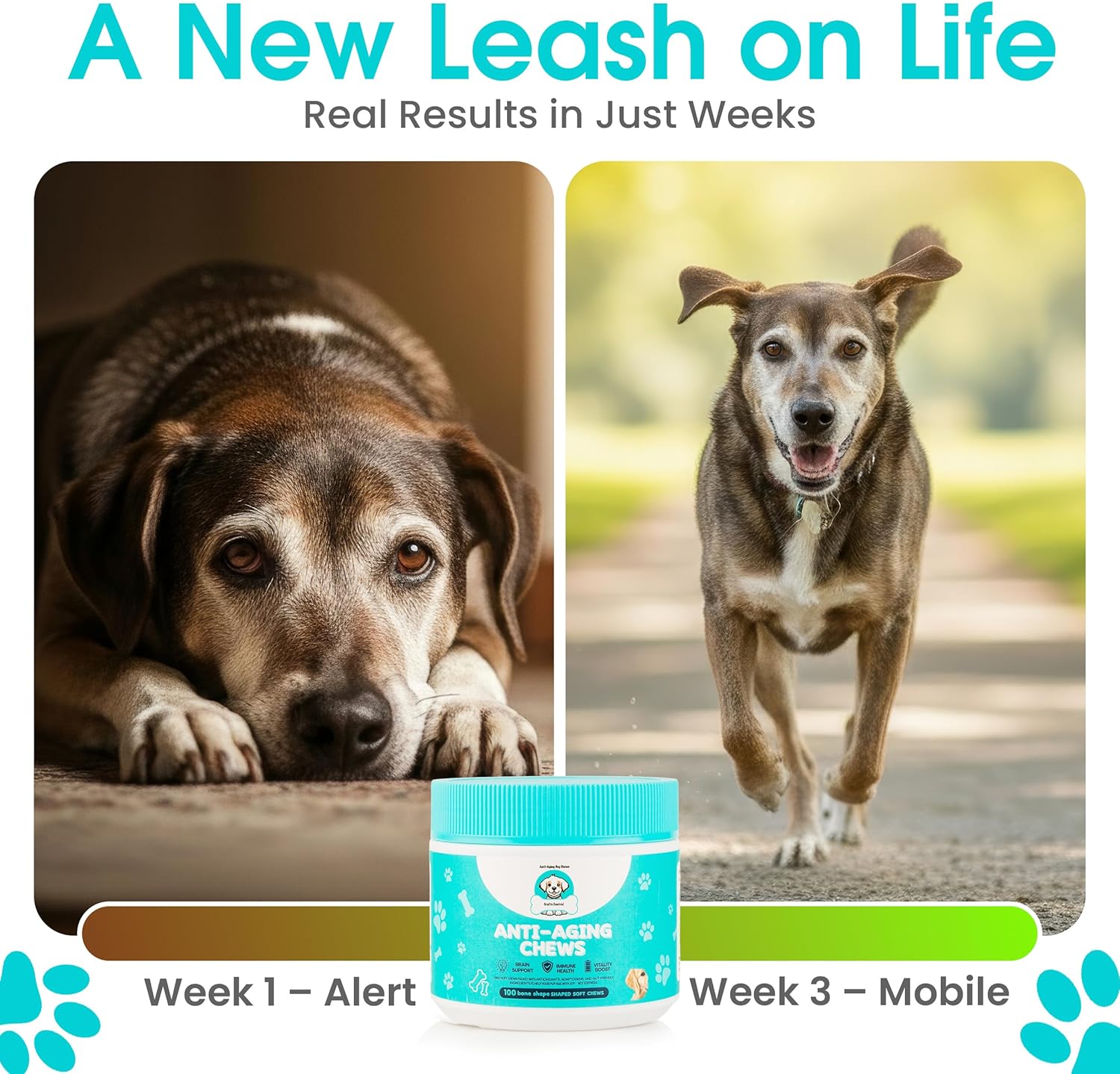 About this item Promotes Healthy Aging in Senior Dogs – Formulated with nicotinamide riboside to help support cellular health and maintain normal NAD+ levels as dogs age. Supports Brain, Joint, and Heart Health – Omega-3 fatty acids help maintain healthy brain function, joint flexibility, and cardiovascular wellness. Includes Essential Amino Acids – Helps support muscle maintenance, energy production, and overall vitality in older dogs. Digestive and Immune System Support – Contains probiotics to help maintain healthy digestion and support normal immune function. Tasty Bacon Flavor Dogs Love – Soft chews are easy to give daily and made without artificial colors, flavors, or preservatives. 100 Bone Shape Soft Dog Chews › See more product details