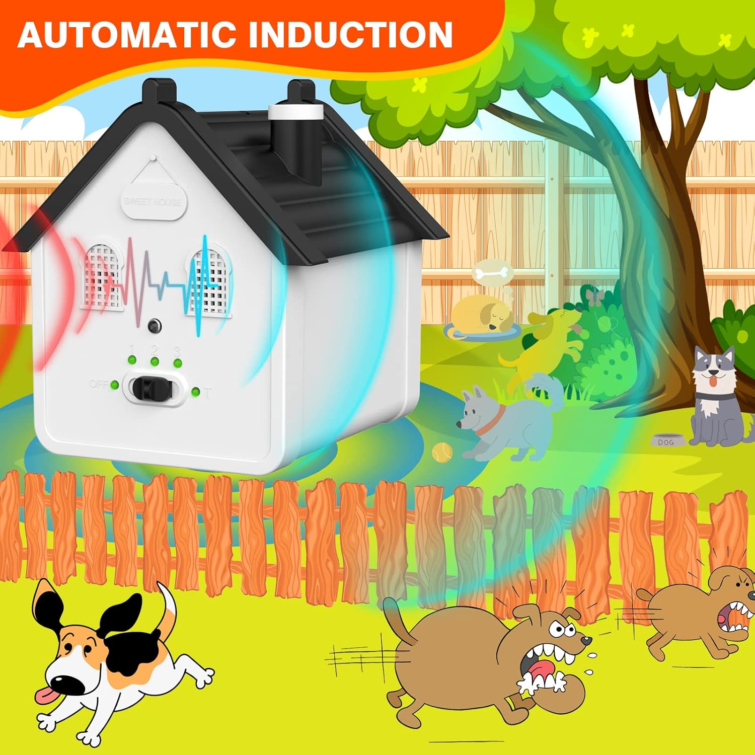 Anti-Barking Device, 2-in-1 Dog Bark Deterrent Device with Up to 50 Ft Range – Dog Training & Behavior Aid, Dog Barking Control Device Safe for Humans & DogsFeatures:The anti-barking device uses ultrasonic sound to stop dogs from barking.Our stop-barking dog device is designed in the shape of a birdhouse, adding a decorative touch to your garden or home.The anti-barking device is durable and weatherproof, perfect for outdoor use.Safe and humane, the anti-barking device can be used on all breeds and sizes of dogs.Testing the Outdoor Barking Control Device:Set the mode switch on the dog barking control device to "Test."Hold the indoor anti-barking device with the indicator light facing you. The ultrasonic dog bark deterrent should be kept at arm’s length from your ears.To trigger the ultrasonic sound, say “Woof” loudly into the microphone.Specifications:Size: 5.31 x 5.03 x 5.78 inchesWeight: 0.73 lbPower: 1 x 9V battery (not included)4 Modes of Anti Barking Device:T: Verify that the microphone and speaker are functional.1: Low Range (Up to 15 feet)2: Medium Range (Up to 30 feet)3: High Range (Up to 50 feet)Notes:The dog barking deterrent device will not work on deaf or hearing-impaired dogs.Humans cannot hear ultrasonic sounds. However, precautions should be taken when preparing the outdoor bark control for use. It’s best to keep the device at arm's length from your ear.The adaptability of each dog is different. If barking does not stop immediately, please allow up to 2 weeks for training.Package Includes:1 x Anti Barking Control Device1 x User Manual1 x Lanyard