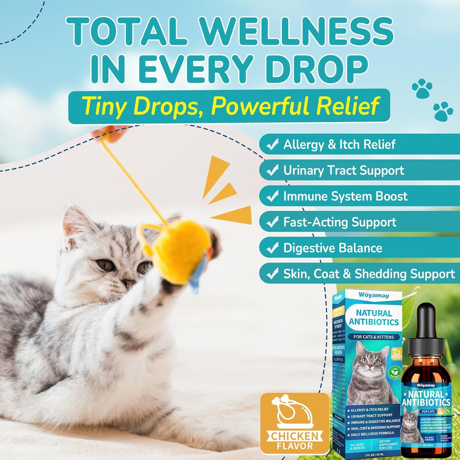 About this item NATURAL ANTIBIOTICS FOR CATS: Our natural cat antibiotic drop help combat common issues such as allergy relief, itch relief, urinary tract balance, respiratory comfort, and more. Formulated to boost the immune system and support recovery, it promotes natural defenses and helps to rejuvenate cats quickly. When your cat feels better, you do too. ALLERGY & IMMUNE SUPPORT: Helps reduce signs of occasional sneezing, itching, watery eyes, excessive paw licking, or hot spots caused by seasonal or environmental factors like pollen or dust. Supports clear breathing and skin comfort while strengthening your cat’s immune health for all-around wellness and protection. Cat allergy relief for cats—fast, safe, and effective. HERBAL & DAILY WELLNESS FORMULA: Natural cat antibiotics drop with cranberry, pau d’arco, olive leaf, echinacea, wormwood, eleuthero, thyme, brewer’s yeast, flaxseed oil, and slippery elm. With prebiotics & probiotics for digestive health, plus B vitamins & Omega-3 for a shiny coat and less shedding. Free of GMOs, sugar & artificial additives. Safe for all ages and breeds—even sensitive cats. Natural allergy relief antibiotics for your furry friend. FAST ABSORPTION LIQUID FORM: Unlike chews or powders, our liquid blend absorbs quickly and can be mixed with food, water, or given directly. This natural antibiotic drop blends effortlessly into your pet’s routine—no stress, no struggle, just effective care every day. Great for long-term daily use, and gently supports balanced digestion and improves overall health. TASTY CHICKEN FLAVOR WITH REAL BENEFITS:Purr-worthy and packed with wellness, these natural antibiotic for cats support skin, coat, and vitality—all in a chicken flavor they’ll come running for. Cats love to stretch, climb, and explore—staying healthy helps them do it all. One daily dose, one simple routine, one happy cat. › See more product details
