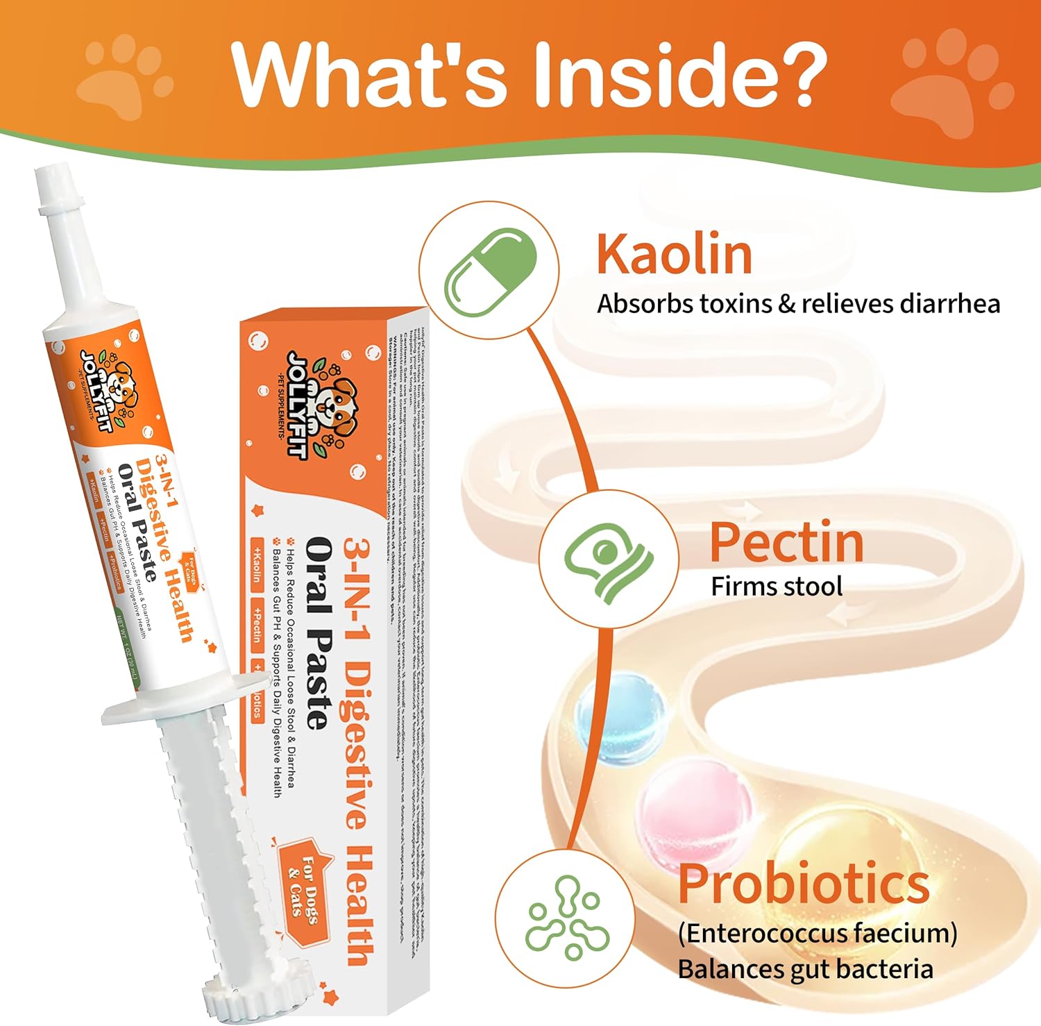 About this item Digestive Support for Gut Balance - This 3-in-1 oral probiotic paste for dogs & cats helps reduce occasional loose stools and diarrhea due to stress, diet changes, or environment. Kaolin pectin for cats combine to firm stools and ease digestive discomfort. Probiotic Boost for Gut Balance: This antidiarrheal for kittens contains 0.35 billion CFU of Enterococcus faecium to help balance gut bacteria and support a healthy microbiome for better digestion. Easy to Administer: Tasty chicken flavor and smooth texture ensure pets willingly consume the paste, making it hassle-free for daily or situational use. Safe for All Sizes and Breeds: Designed for cats and dogs of all sizes, from small to large breeds. Administer the appropriate dosage based on your pet’s weight for optimal results. About Batches: Due to naturally extracted ingredients, the product may vary slightly in color and viscosity, but it will still maintain the same benefits for your furry friend. › See more product details