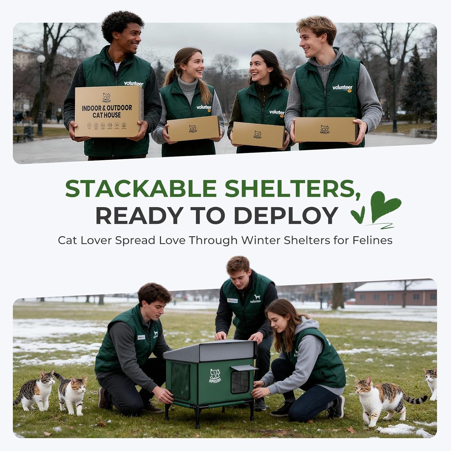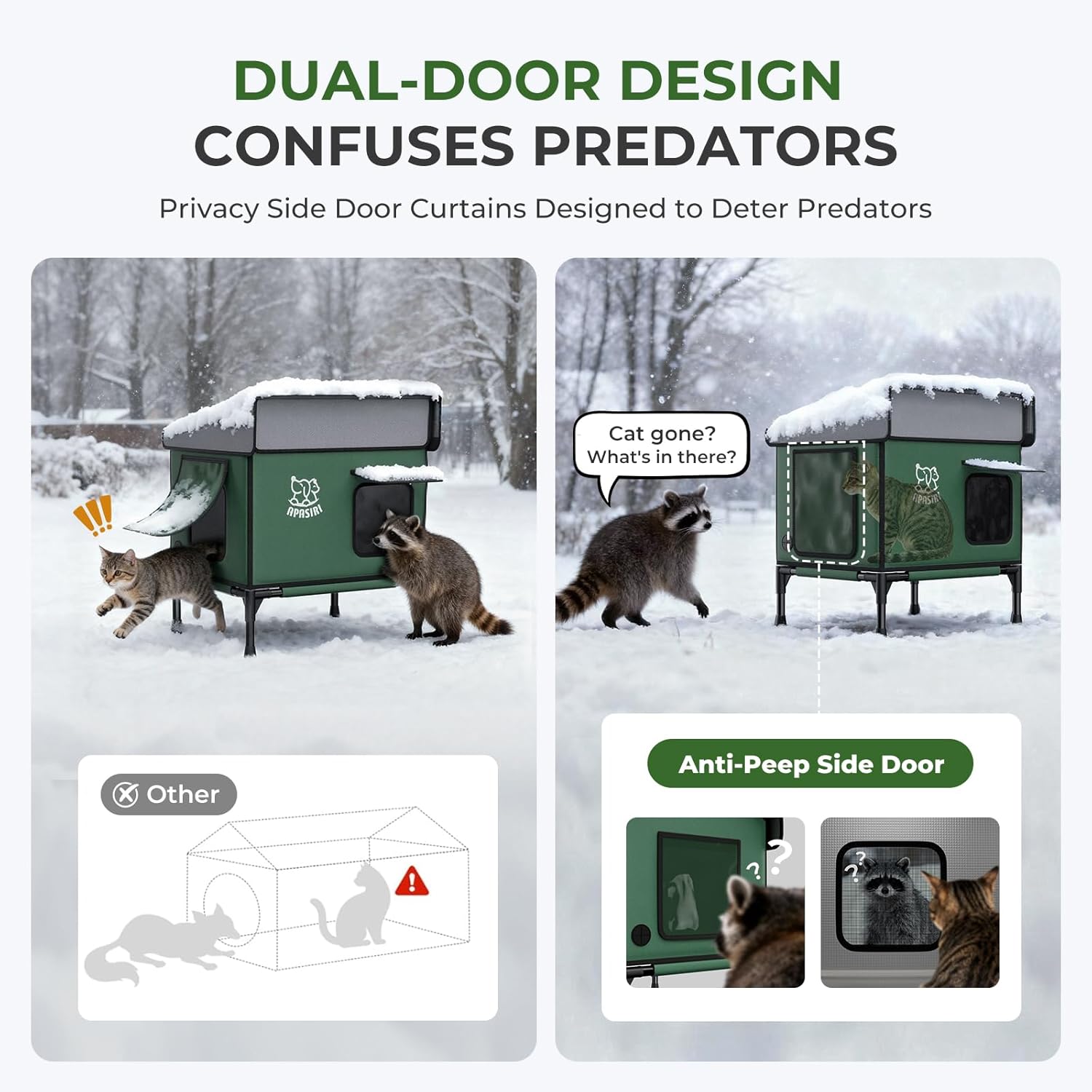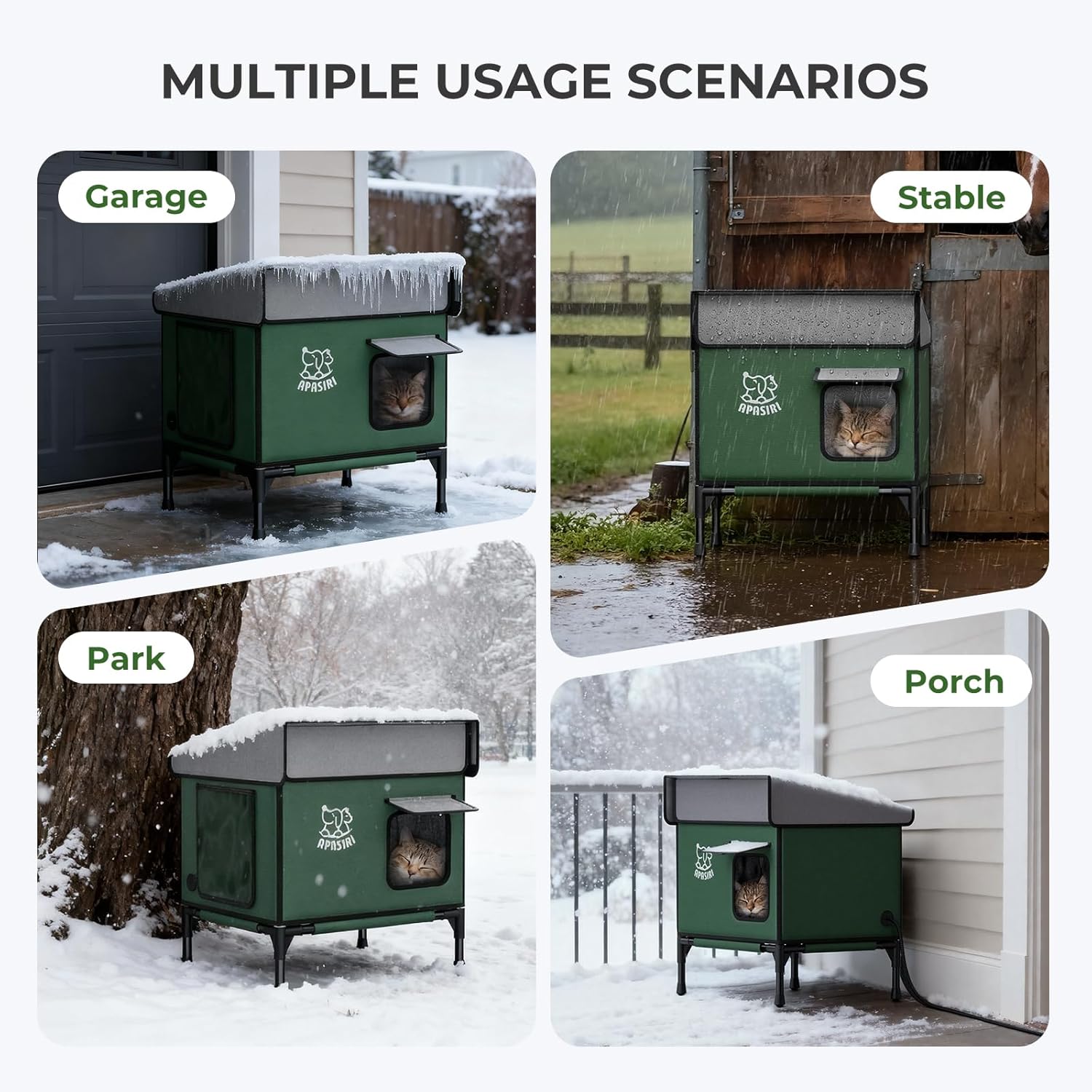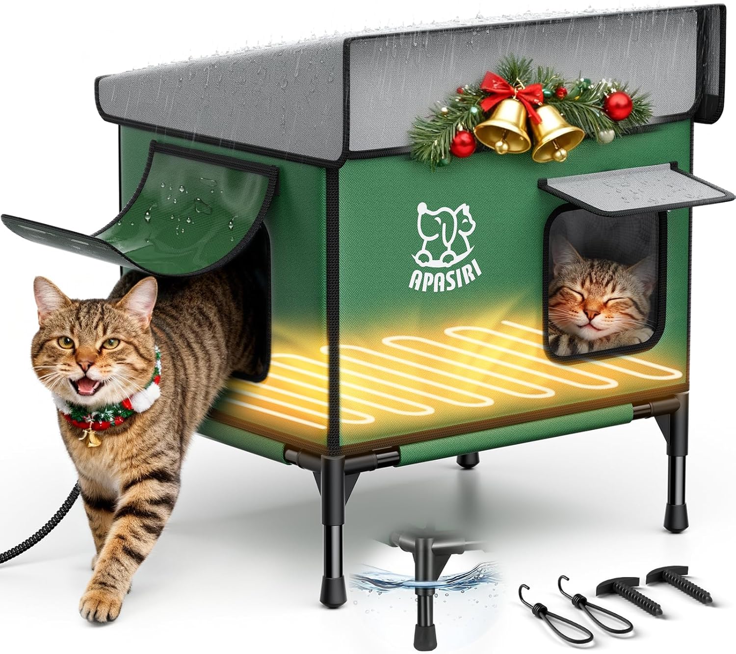 About this item Snow Rain Resistant & Water Resistant: The outer layer uses outdoor - specific water Resistant Oxford cloth. Snow water rain slides right off without seeping in - even during heavy downpours, the inside stays dry. Dual-Door Design: Dual doors with a peek-proof side door, gives your cat a quick, easy exit when they detect danger — no more being trapped with only one way out when predators (like stray dogs or raccoons) approach. Elevate Design to Fend Damp: Damp ground often pools water; an elevated house keeps the cat shelter dry at all times, keeping cats more comfortable. No more worrying about cats lying on wet ground! Stable Outdoor Cat House: With a durable fiberglass internal frame, the shelter stands strong against 65kg of weight, a warm home for stray cats in winter. 5-Layered Warmth: The 5-layered insulation isn't just for show — it blocks cold drafts, repels moisture, and maintains a stable, warm indoors, no matter how harsh the outdoor conditions get. Snow & Water Slide Off Automatically: 30° steep - slope roof lets snow slide off naturally - no buildup. Rain drains smoothly, so extra weight doesn't stress the roof and always keep dry. Thick Wear-Resistant Material: The main body uses 900D thick Oxford cloth with a scratch - resistant coating. Daily scratching or claw - sharpening won't cause rips, pilling, or snags - it stays intact long-term. Auto On/Off Heated Pad: Winter's no match for this heated pad! It shuts off automatically if it gets too warm, kicks back on when it cools down—your rescue cat gets steady, cozy warmth all day long. Hidden Entrance Designed: Unlike open shelters, this hidden - entrance design blends into outdoor settings. Strays are more likely to use it, as it feels like a warmth spot. Winter-Ready Cat House: Designed specifically to help helpless stray cats from the cruelty of winter — when snow piles up and temperatures drop below freezing, this house becomes their safe, warm escape from the bitter cold that threatens their lives. Show more › See more product details