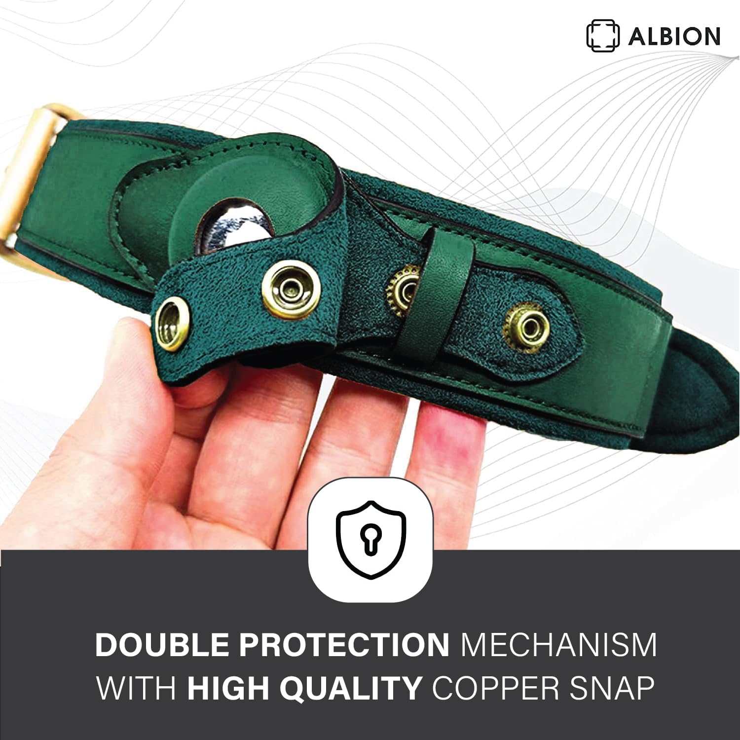 About this item AIRTAG DOG COLLAR - PLEASE MEASURE YOUR DOG's NECK BEFORE BUYING. Whether your fluffy friend is a bit adventurous or you want to know where he is when you’re on a vacation, our air tag dog collar with an integrated AirTag holder is a perfect choice. TOP-NOTCH MATERIALS - This custom dog collar is made with superior quality, highly durable cow leather and microfiber lining with a smooth finish, guaranteed to survive the test of time. Your leather dog collar is also covered by a one year warranty by Albion against manufacturing defects. PROTECTIVE - We designed our dog tracker collar with gps with a built-in pocket that ensures a perfect fit for Apple AirTag, giving the device full functionality without the fear of losing or breaking it. COMFORTABLE - These gps dog collars are adjustable and have a functional, lightweight design. Moreover, they come in three sizes, ready to match your beloved doggy. Please check our size chart before ordering. LIMITLESS RANGE TRACKING - Our apple tag collar will allow you to track your dog anywhere in the world 24/7, no battery, wifi, or network needed. (the Apple AirTag is sold separately) › See more product details