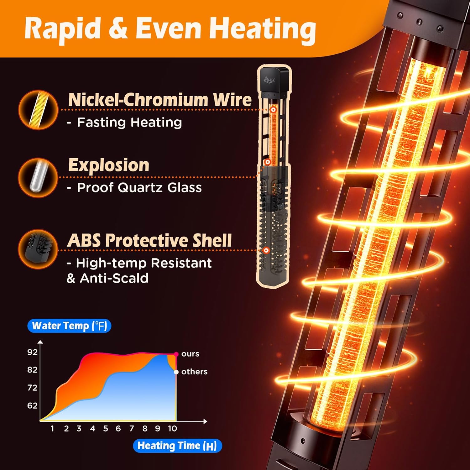 Durable Quartz Fish Tank Heater: This aquarium heater is built with quartz heating rods that deliver fast, even, and efficient heat transfer. Its heat-resistant ABS shell and controller provide reliable performance, safe operation, and long-lasting durability. Advanced Safety Protection Systerm: The built-in anti-dry and overheat protection keeps your aquarium safe. If the water temperature rapidly exceeds 95°F / 35°C, the LED screen flashes “EE”and stops heating automatically; if the fish heater is not fully submerged, it displays “Er.” These smart alerts help prevent damage and maintain a stable, comfortable environment for your fish. Intelligent Constant Temperature Control: The fish tank heater automatically maintains a steady water temperature; When the temperature drops 1°F below the set value, it automatically starts heating again until it returns to the target temperature, maintaining stable warmth at all times. Ensuring consistent comfort for your fish. Easy & Secure Temperature Adjustment: Adjust the water temperature effortlessly using the external controller. Long press the lock button for 1–3 seconds to enter setting mode, then press the temperature button—each press adjusts by 1°F/°C (range: 59°F–94°F / 15°C–34°C). The system automatically locks after 3 seconds of inactivity to prevent accidental changes. Warm Tips for Safe Use: Please always fully submerge the heater before powering on and ensure proper water circulation. Allow it to cool in water for 15–30 minutes after turning off to prevent the residual temperature melting shell. For any questions or support, please feel free to contact us. › See more product details