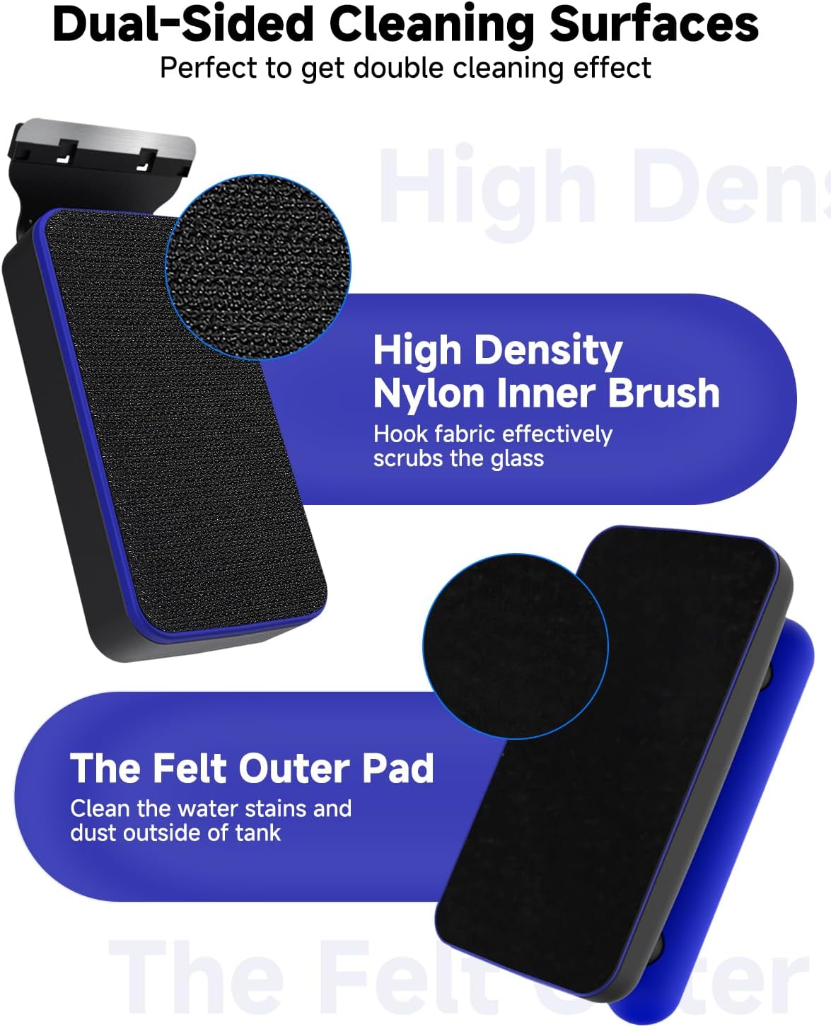 SUPER STRONG MAGNETIC POWER: The AQQA magnetic aquarium glass cleaner contains a high-quality rare earth magnet which holds the glass cleaner firmly to the aquarium glass. Tips: magnetism strength depends on glass thickness. Size M: Suitable for 0.2 - 0.4 inch thicknesses fish tanks. Size L: Suitable for 0.2 - 0.6 inch thicknesses fish tanks. Size XL: Suitable for 0.4 - 1.0 inch thicknesses fish tanks. DOUBLE-SIDED CLEANING BRUSH: The fish tank glass cleaner is designed with fabric and mini hooks on the side, which could effectivly scrubs the glass and clean the water stains and dust outside of tank, ergonomic design of the handle allow easy and comfortable cleaning with the aquarium glass cleaner. SPECIAL FLOAT-UP DESIGN: This aquarium algae scraper glass cleaner ensures convenience during use. When you remove the soft side from the glass, the part of the cleaner inside the aquarium floats to the water surface. This enables you to effortlessly retrieve the cleaner without wetting your hands or causing any disturbance to the fish or aquatic plants. USER FRIENDLY HANDLE DESIGN: This aquarium glass cleaner is ideal for both experienced and novice fish keepers. It boasts a user-friendly design, making it easy to operate and install/remove blades. Furthermore, it won't cause any scratches to the glass during cleaning, ensuring a hassle-free cleaning experience. COME WITH 2 BLADES: The aquarium glass cleaner including 2 blades are made of stainless steel or plastic. Suitable for removing algae and stubborn dirt from the aquarium glass, and can even handle crusty algae and other particularly stubborn dirt. Stainless steel blades suits glass aquariums, plastic blades suits Acrylic aquariums.(The blade is embedded in the foam board, please check carefully. thank you.) › See more product details