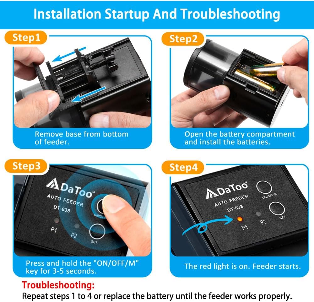 About this item 【DaToo Automatic Fish Feeder】: Who can help you take care of your lovely fish when you are busy at work or away on holiday? This is the question every aquarium hobbyist is thinking about. Now DaToo can help you solve this worry easily. DaToo automatic fish feeder has intelligent feeding mode, precise customised feeding amount, airflow moisture proof function, three installation methods, so you can focus on your work or enjoy your holiday without any worry! 【INTELLIGENT FEEDING MODE】: DaToo automatic fish feeder provides you with 2 different automatic feeding modes, you can choose freely according to your fish's needs. Mode 1: Feed once every 24 hours. Mode 2: Feed 2 times every 24 hours. In addition, DaToo Aquarium Auto Feeder also has a manual feeding mode, just press the manual button and you can enjoy the fun of feeding your pet fish immediately! 【Precise Customised Feeding Amount】: For most small aquarium owners, too much food can affect the water quality and even the health of your pet fish. But you won't have to worry about that when you choose DaToo automatic feeder, DaToo provides you with 8 choices of feeding amount, perfect for aquariums of different sizes. Just slide the toggle on the feeder and you can choose the amount of feed that is best for your tank as needed. Very simple and convenient! 【AIRFLOW MOISTURE PROOF FUNCTION】: DaToo creatively designs an air hole at the end of the feeder. You can connect an air hose and air pump through this air hole, which can deliver a constant flow of fresh dry air to the food storage chamber, avoiding the food from getting damp and caked and spoiled. The hidden feeding port can effectively prevent water droplets, dust and dirt from falling into the food, so that your fish can always eat healthy and safe fresh food! 【EASY INSTALLATION & ONE YEAR WARRANTY】: DaToo offers you three mounting options to fit different types of aquariums. You can clip the feeder to the wall of your tank or to the lid of your semi-open aquarium with the adjustable clamp base. You can also use the sticker base to stick the feeder to your tank's feeding port. Very easy to operate, easily helps you with setup! We provide one year warranty and 24 hours professional customer service. Buy With Confidence! 【HOW TO TURN ON THIS FEEDER】: Step 1: Remove base from bottom of feeder. Step 2: Open the battery compartment and install the batteries. Step 3: Press and hold the "ON/OFF/M" key for 3-5 seconds. Step 4: The red light is on. Feeder starts. (NOTE: To start the feeder, you need to long press the "ON/OFF/M" key instead of pressing it once) › See more product details
