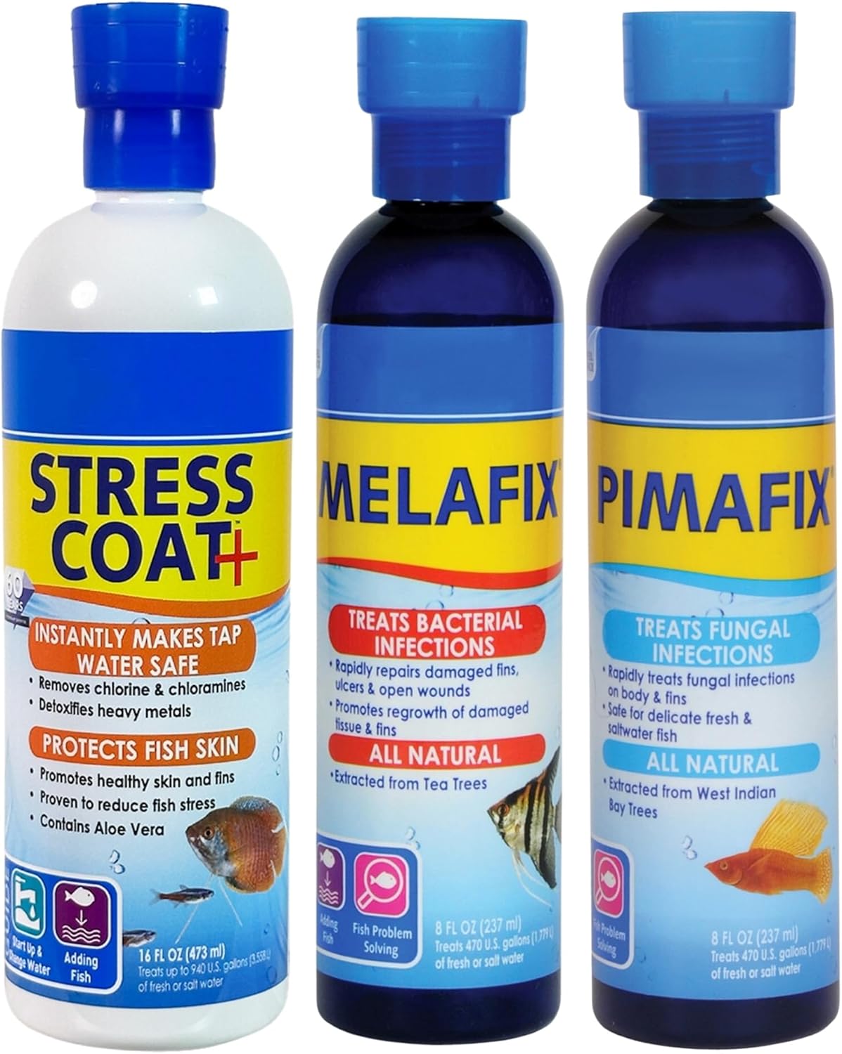 Keep your freshwater aquarium clear and balanced with this 4-piece kit — MeIafix 8 oz, PlMAFlX 8 oz, Stress Coat 16 oz, and Trinity Treats Microfiber Cleaning Cloth. MeIafix and PlMAFlX help maintain fish wellness and clean water, while Stress Coat with Aloe Vera strengthens the natural slime coat and conditions tap water. The soft microfiber cloth gently cleans glass without scratching or harsh chemicals.