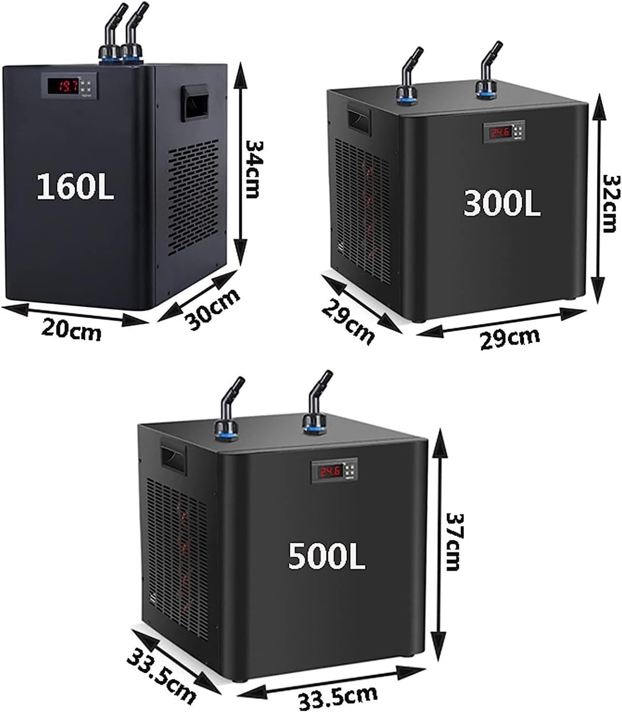 The chiller is for fresh and salt water tanks, aquariums and hydroponics. The easy-to-use temperature control allows you to control the desired temperature range as needed. Specifications: AL-160L: Voltage: 220V/110V Power: 1/10 H-P Cooling power: 270W Rated cooling current: 1.0A Cooling water volume: ≤160L Input and output specifications: φ12 or φ6 Atomizer: pure titanium atomizing core Product size: 34*20*30cm Net weight: 12kg Tip: If you want the temperature to be below 20°C, it is recommended to keep the water volume below 100 liters. AL-300L: Voltage: 220V/110V Power: 1/3H-P Cooling power: 600W Rated cooling current: 1.6A Cooling water volume: ≤300L Input and output specifications: φ12 or φ6 Atomizer: pure titanium atomizing core Product size: 29*29*32cm Net weight: 15kg AL-500L: Voltage: 220V/110V Power: 1/2H-P Cooling power: 1200W Rated cooling current: 2.3A Cooling water volume: ≤500L Input and output specifications: φ12, φ16 or φ6 Atomizer: pure titanium atomizing core Product size: 33.5*37*33.5cm Net weight: 23kg If you have any questions or suggestions, please do not hesitate to contact us, we will contact you within 24 hours and provide you with quality solutions.