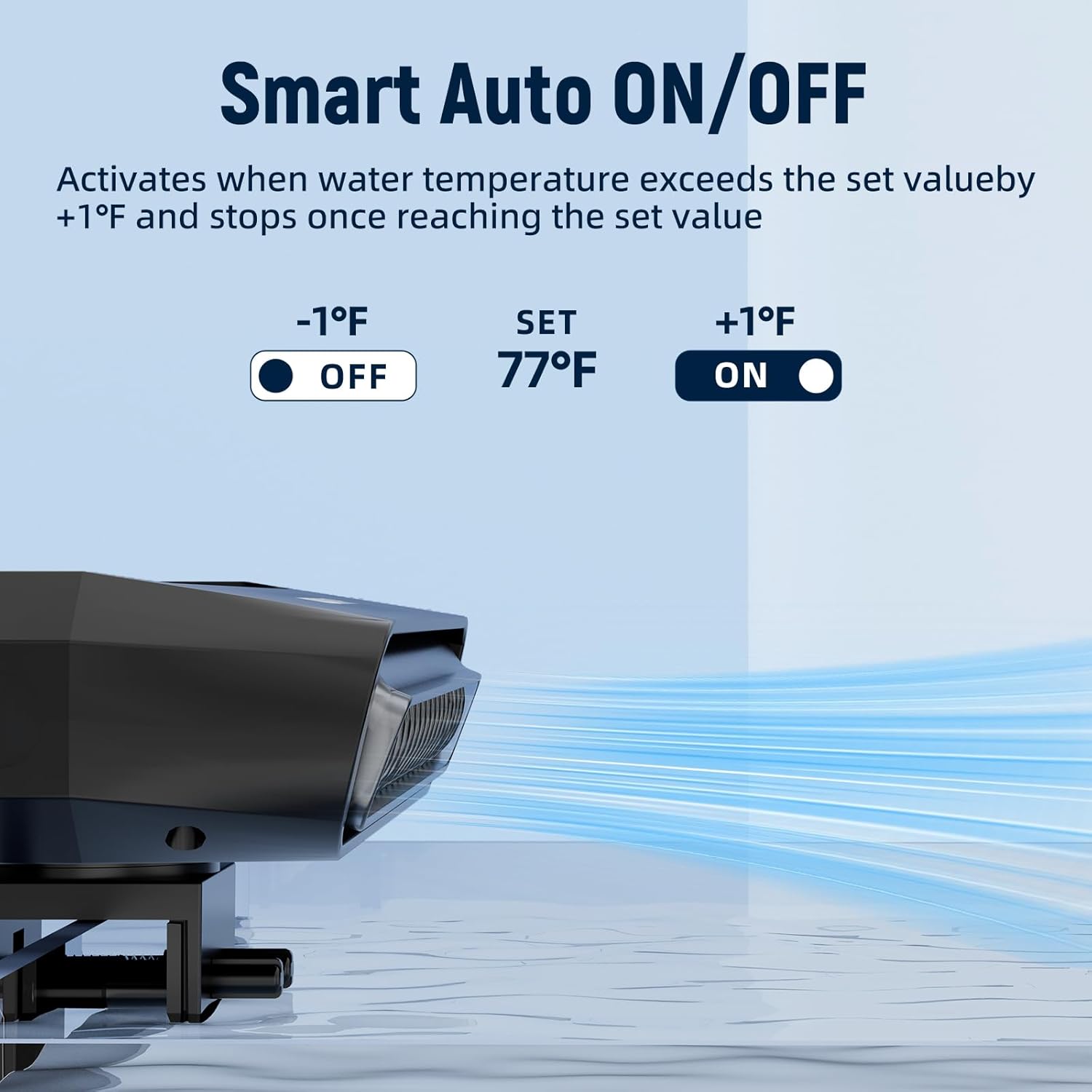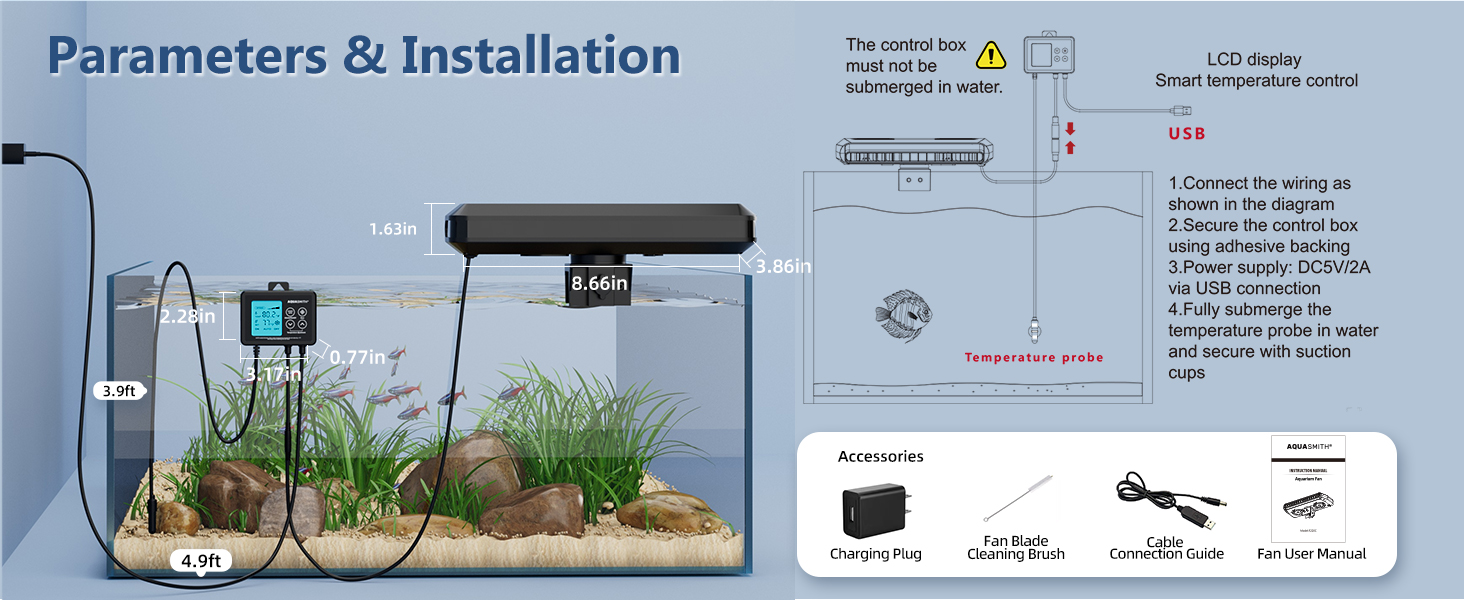 【Necessary Cooler for Aquariums】The summer heat is endangering your axolotl's health, but the AQUASMITH aquarium fan provides the Professional Support. Unlike costly chillers, it offers affordable and efficient aquarium cooling fan. Unlike regular fans,it utilizes the principle of evaporative cooling and features a true temperature control system,with powerful cooling capacity (3°F-7°F), creating an ideal environment for your pets. 【Smart Temperature-Control Fan】The Aquarium Chiller features an independent LED display controller and high-precision temperature probe, with dual display of set temperature and real-time temperature for intelligent water temperature stabilization. With an adjustable range of 59°F-93°F, it's suitable for various aquatic plants and animals requiring cooling, delivering visible cooling effects. It 24/7 Protection for Your Aquatic Pets. 【High Speed、High Output、Ultra-Quiet】The fish tank fan is equipped with a brushless motor and features a unique pressurized air duct design. Dual fans (3000rpm & 3m/s) ensure quiet operation (<40dB) while concentrating airflow onto the water surface to minimize dispersion and achieve rapid cooling, with performance far surpassing other fish tank cooling fan products. With 30° adjustable airflow angle and 360° rotation capability, it better adapts to aquariums of different sizes. 【Auto Start-Stop & Multi-Function】The aquarium cooler system features automatic mode with intelligent start/stop to maintain stable water temperature. It offers 3-Speed Airflow Adjustment,1st gear Ultra-quiet operation;2nd gear for 24/7 operation,3hd gear for extreme temperatures.The Independent Controller Prevents moisture damage to internal components. The ceramic temperature probe is compatible with both saltwater and freshwater environments. 【Out-of-the-box/Professional Support】The Aquarium Chiller Fans features simple installation without requiring additional accessories. The package includes a power plug for quick and easy setup. Its adjustable clip (0.2in-0.95in) effortlessly fits aquarium edges of varying thicknesses,Solving compatibility issues. If you have any questions during use, please contact our customer service team via email. We will provide a solution within 24 hours. › See more product details