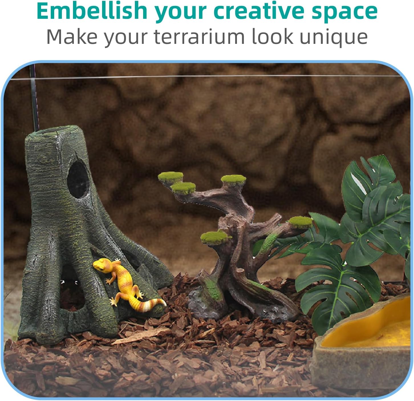 About this item From Relaqcc’s Designer Collection, Fish Tank Decorations for It perfectly simulates a natural cave environment. It is like being in the middle of the jungle. add to natural color and beautiful landscape. Available for hiding cave for fish&reptile to play, adds more fun to their lives, and helps to relieve stress :The Tree Formation are naturalistic decors Designed, The Tree Hollow Hideaway Cave are 4 holes on the fish decor, your lovely pet betta pleco or other smaller fish would be super happy to go in and out of the trunk cave to sleep, rest, hide, play, breed. Reptiles can traverse caves, climb. Can be combined with other ornamentsReptile can climb on the platform to enjoy sun bathing, resting, playing Size: 7 * 7.1 * 8.3 inches(L*W*H). Warm Tips: Put them in cold water and soak them for 10-15 minutes before putting them in the tank. It’s designed to be the perfect decoration for your Terrarium, Ideal for placing in a corner, Get creative! It is constructed from a safety resin material that enables it to be long-lasting. It has a nice naturalistic look that blends with the habitat. This piece provides a great swim-through or hiding spot for fish, betta, shrimp. :Solid one piece construction, it features aeration holes and swim-through chambers, making a healthy environment for your fish pets. Brings a unique mystery and charm to any fish tank › See more product details