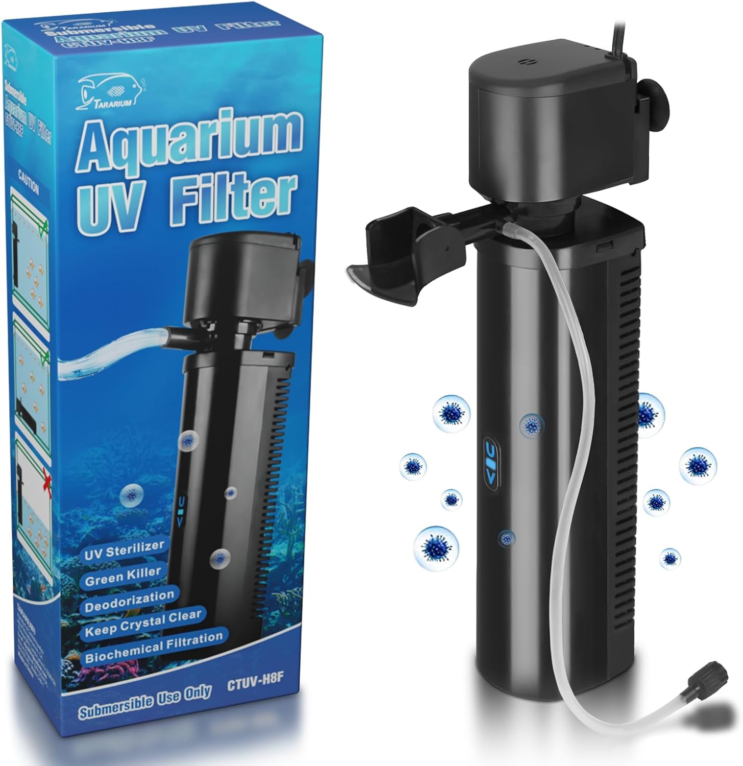 CRYSTAL CLEAR - Turns CLOUDY and GREEN water crystal clear in 3-7 days. The larger the fish tank, the longer it takes. Reduce the number of water changes in the fish tank. DOUBLE FILTRATION - First stage Biochemical Sponge Filter. Second stage 254nm wavelength U-V Light treatment. SEPARATE SWITCHES - Control the water pump and fish tank light separately. When you only want to use the aquarium filter function, you can turn off the fish tank U-V light separately. SMELLS FRESH - Once the fish tank is full of green will be accompanied by the smell. This green killing machine can reduce the unpleasant smell in the fish tank. EASY TO CHECK LIGHT UP - You can easily check that the light is on from the outside of the machine, don't need to take the machine apart to see it. › See more product details